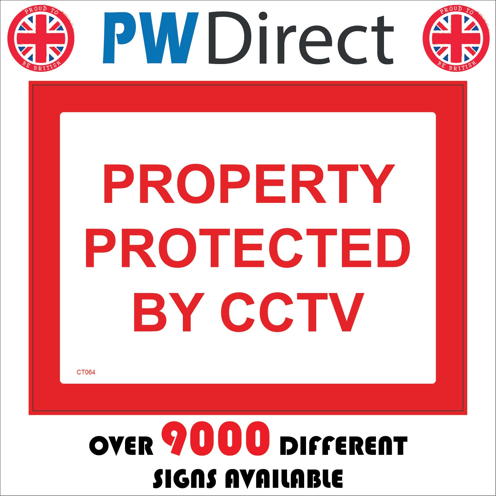 The format of the standard CT064 sign is Billboard Landscape and displays a Red -/Property Protected By CCTV text on a White/Red Background.