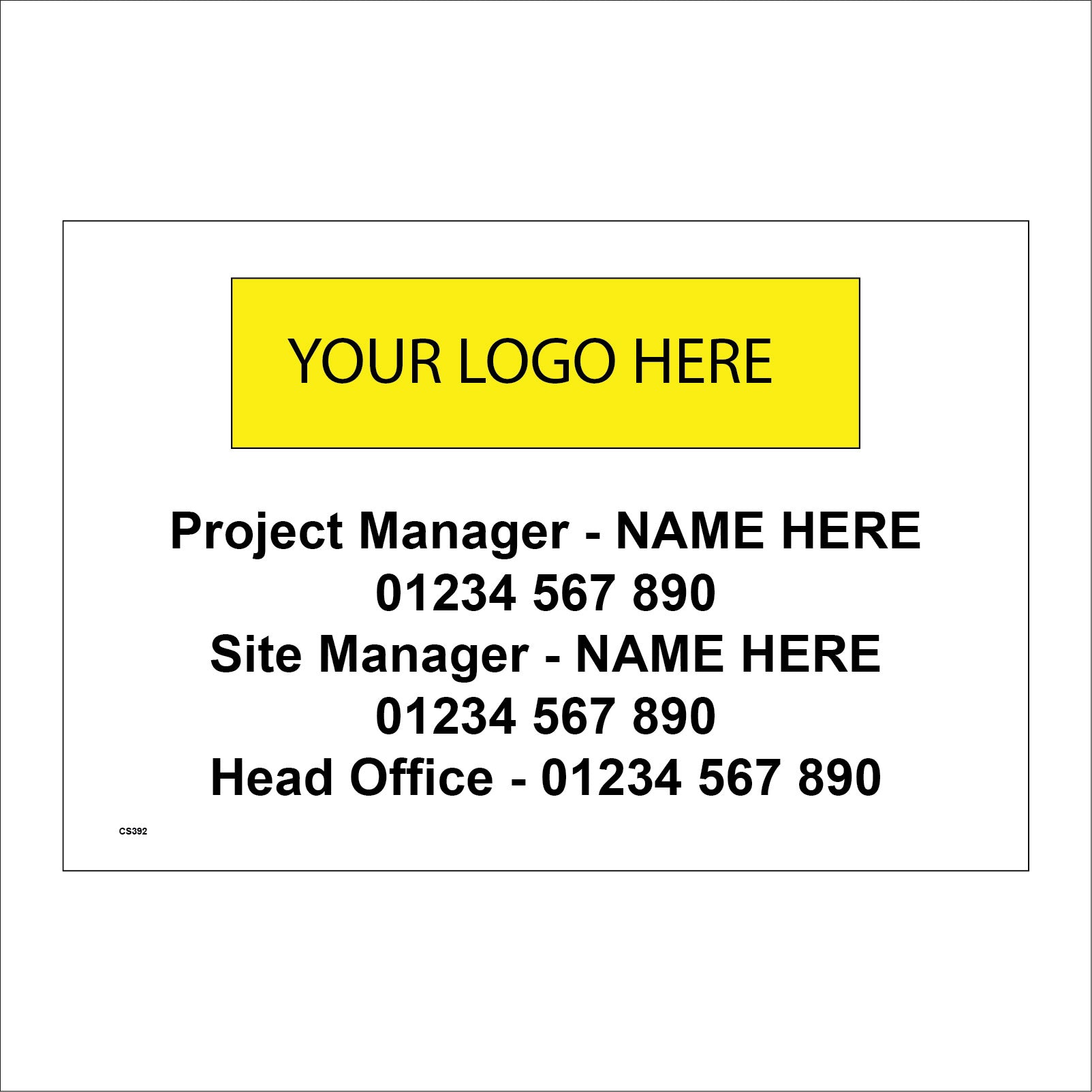 The format of the standard CS392 sign is Billboard Landscape and displays a Black /Project Site Manager Head Office Telephone Logo Company text on a White/Yellow Background.