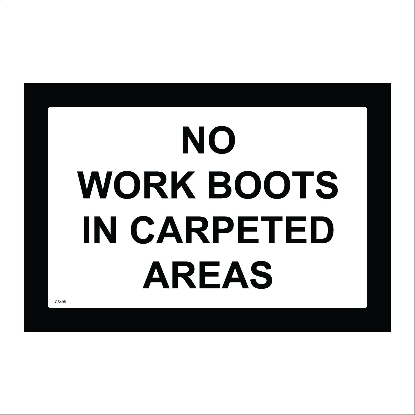 The format of the standard CS495 sign is Billboard Landscape and displays a Black /No Work Boots In Carpeted Area Dirt Respect Spaces text on a White/Black Background.