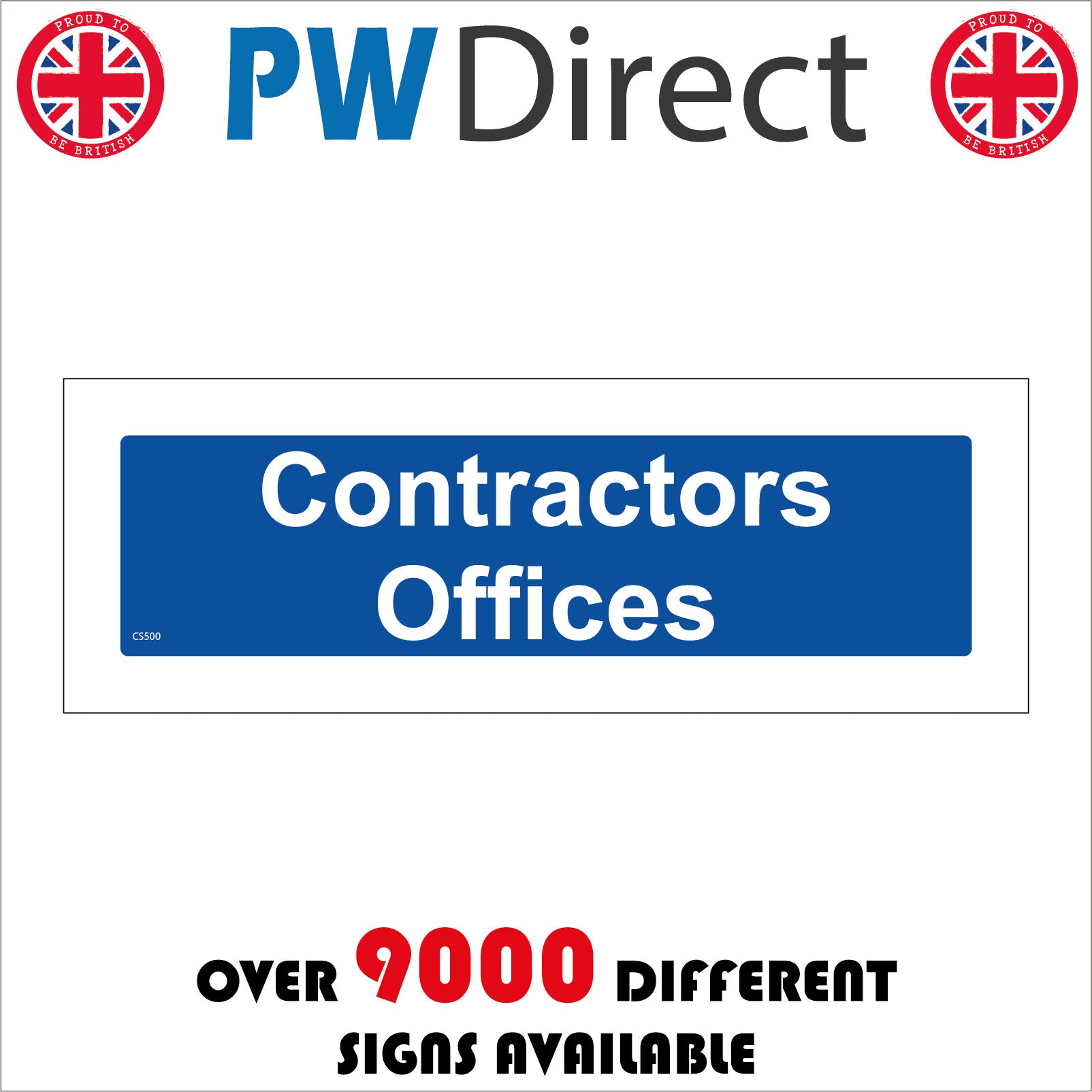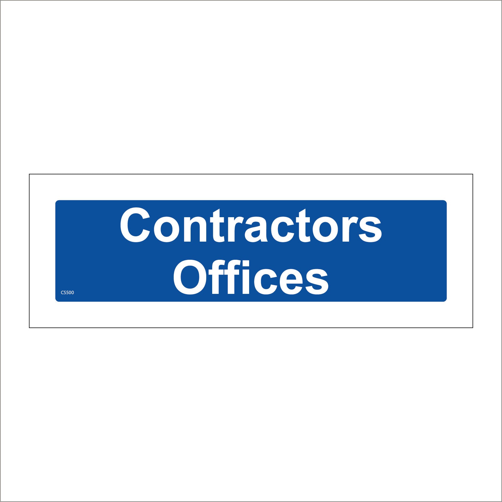 The format of the standard CS500 sign is Long Landscape and displays a White /Contractors Offices Sub Space Room Unit Cabin text on a Blue Background.