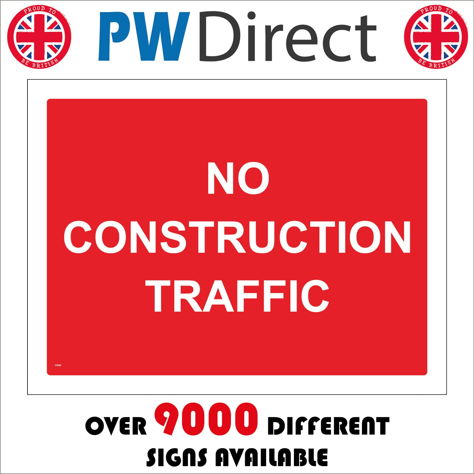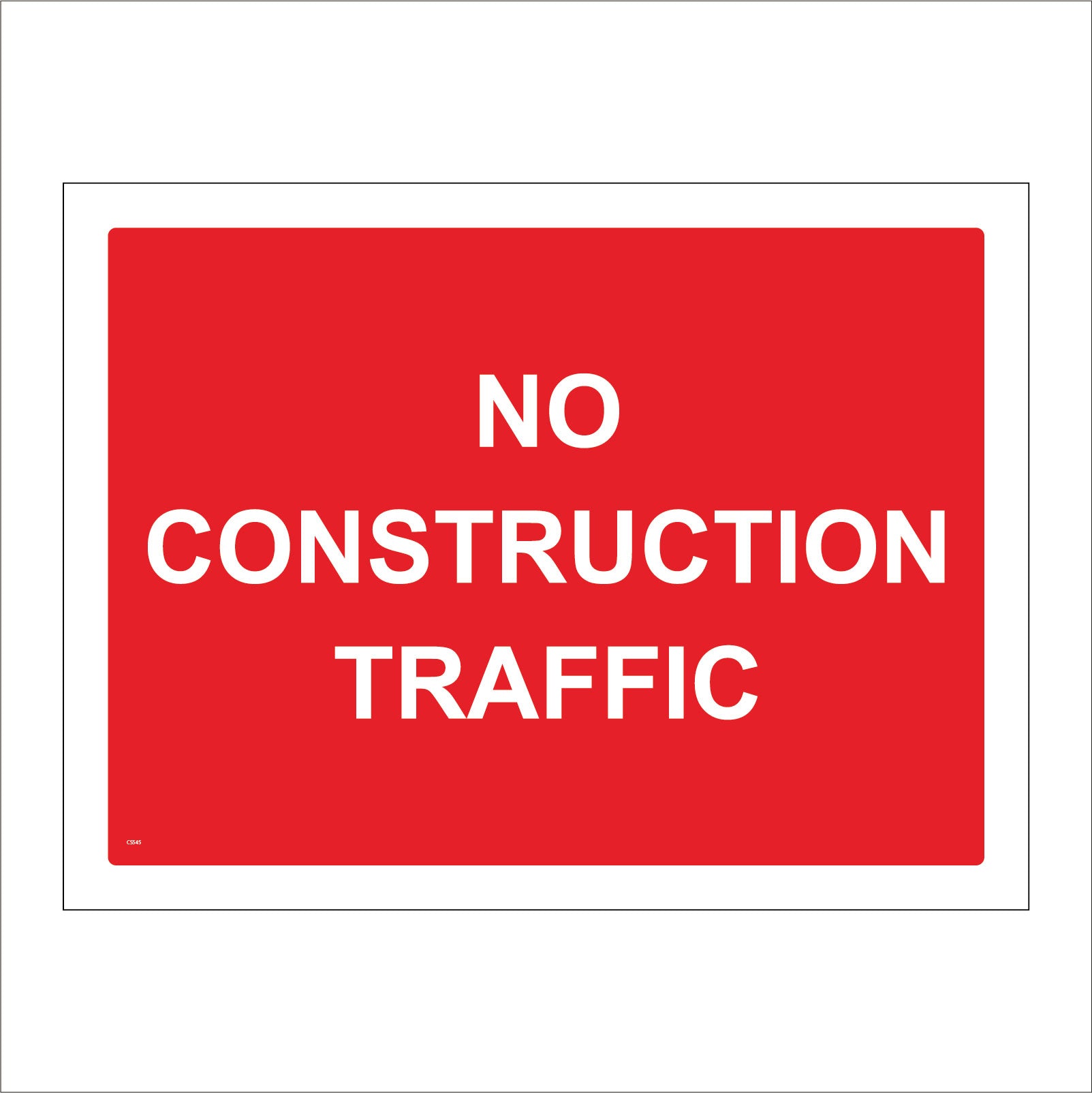The format of the standard CS545 sign is Billboard Landscape and displays a White /No Construcion Traffic Trucks Vans Wagons Lorries Diggers text on a Red Background.