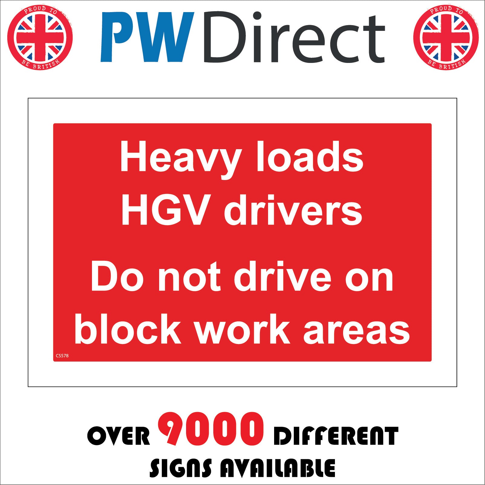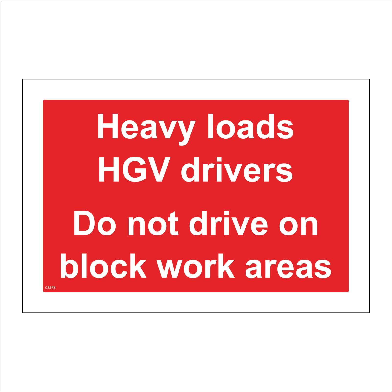The format of the standard CS578 sign is Billboard Landscape and displays a White /Heavy Loads HGV Drivers Not Drive On Block Work Areas text on a Red Background.