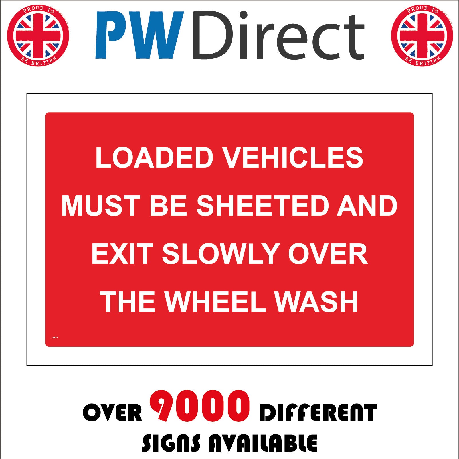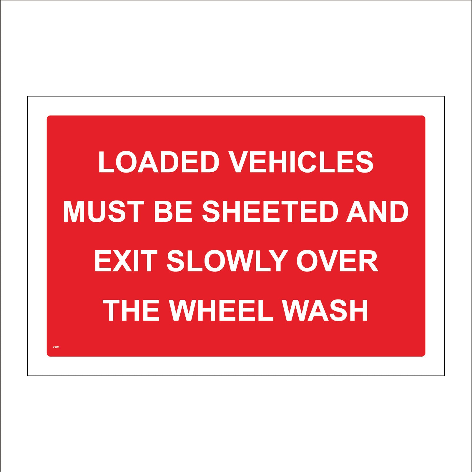 The format of the standard CS579 sign is Billboard Landscape and displays a White /Loaded Vehicles Must Be Sheeted Exit Slowly Wheel Wash text on a Red Background.