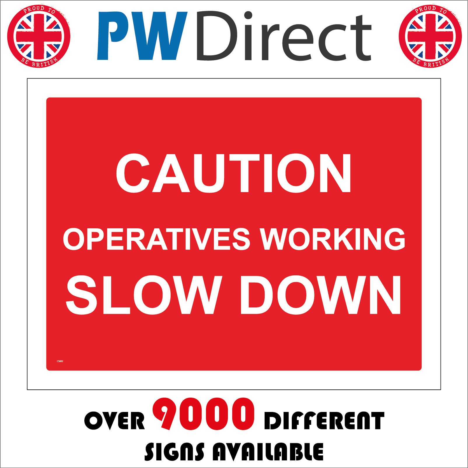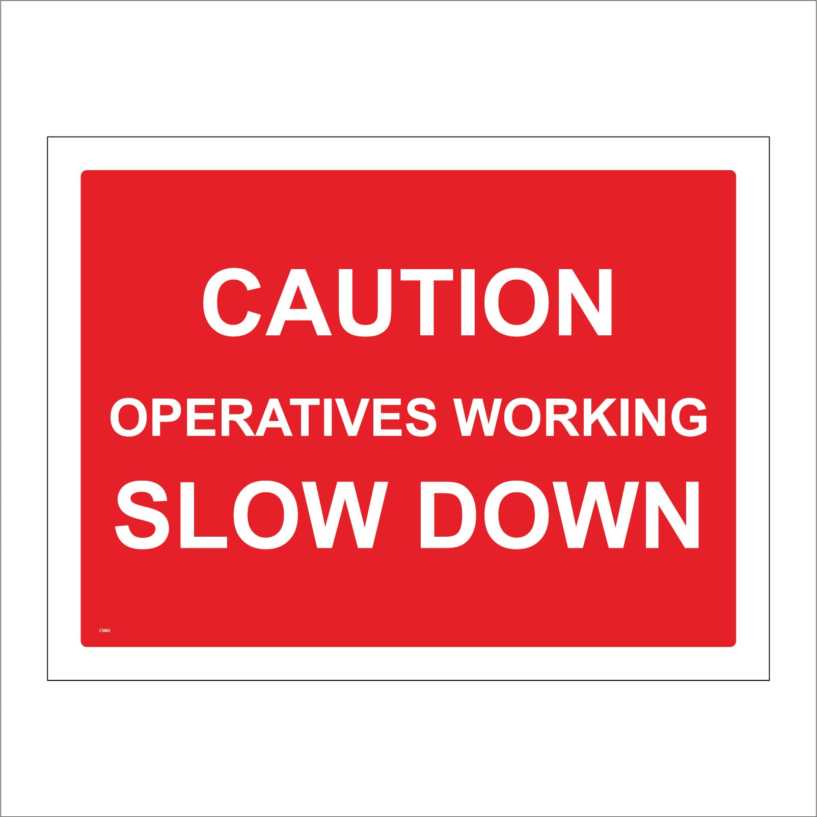 The format of the standard CS602 sign is Billboard Landscape and displays a White /Caution Operatives Working Slow Down text on a Red Background.