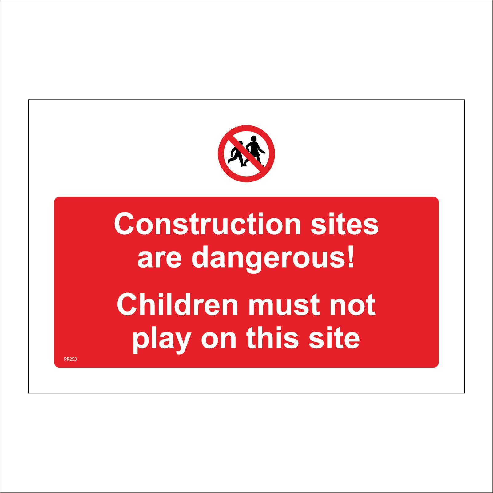 The format of the standard PR253 sign is Billboard Landscape and displays a White Circle Children/Construction Sites Are Dangerous! Children Must Not Play On This Site text on a Red Background.