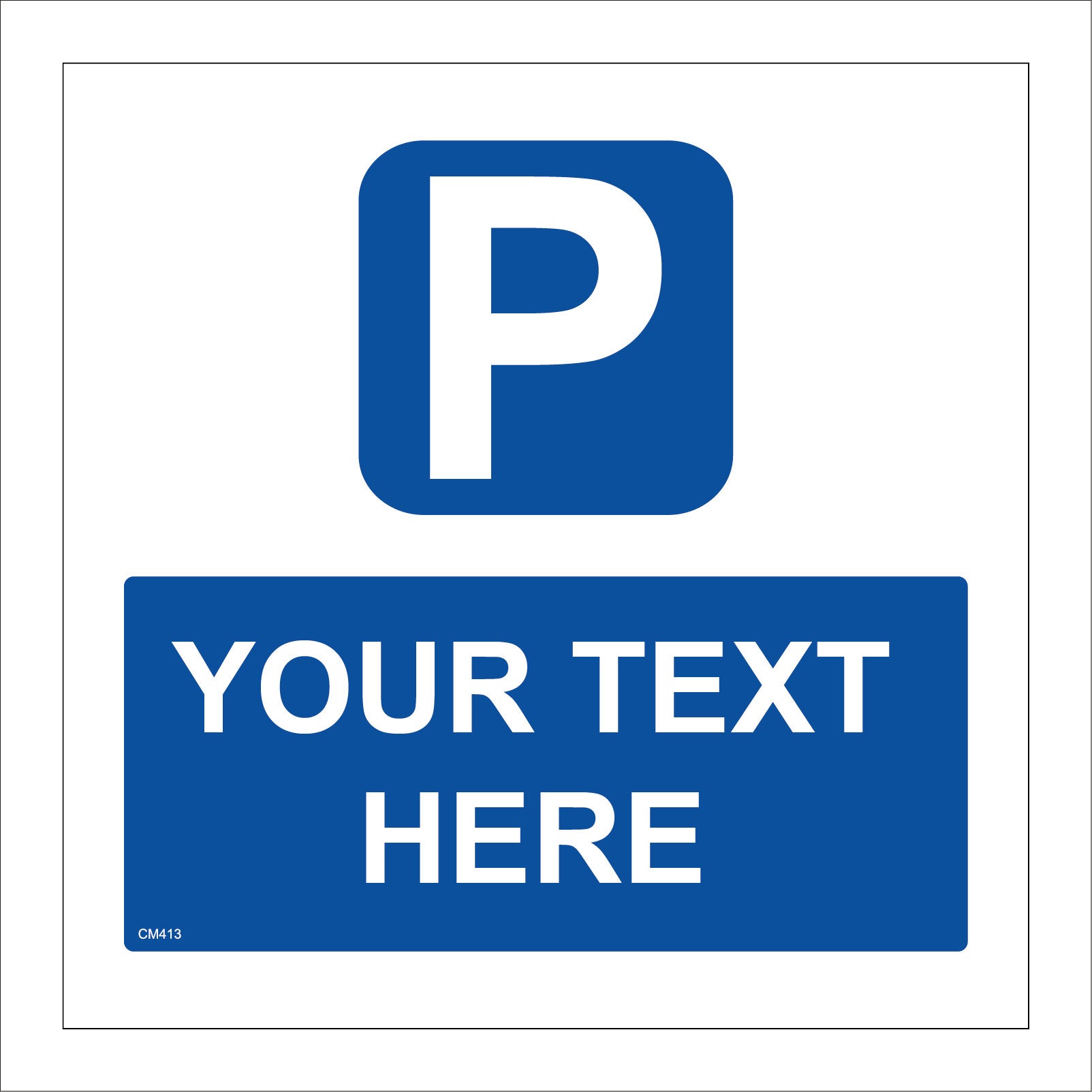The format of the standard CM413 sign is Square and displays a White P Logo/Parking For Number House Flat Bay Site Location Choice text on a Blue Background.