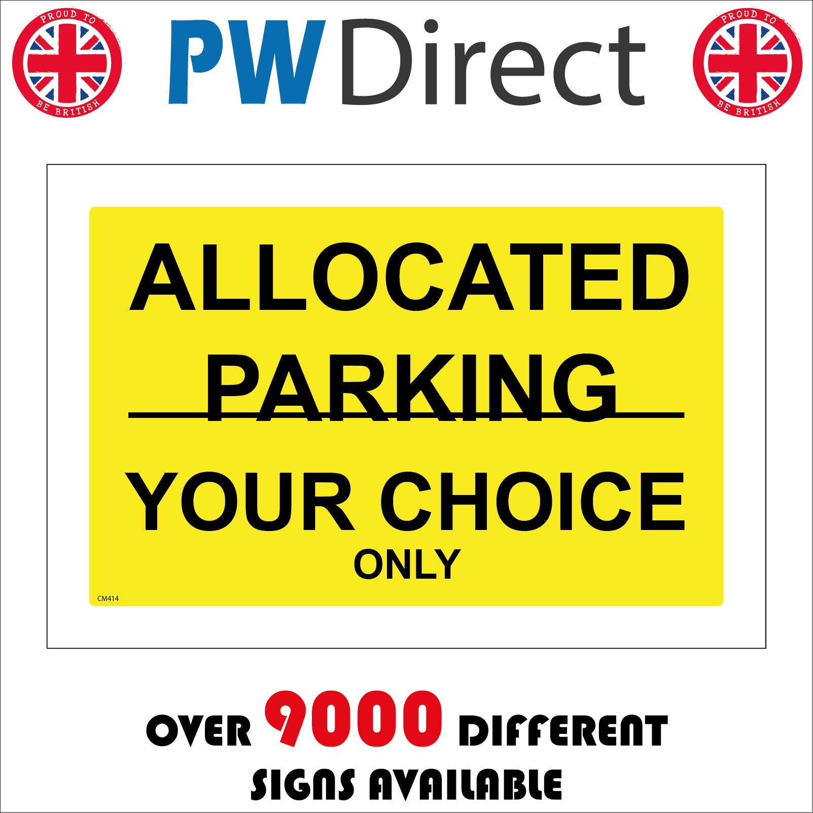 The format of the standard CM414 sign is Billboard Landscape and displays a Black /Allocated Parking Number Choice Pick Letter Bay Workplace text on a Yellow Background.
