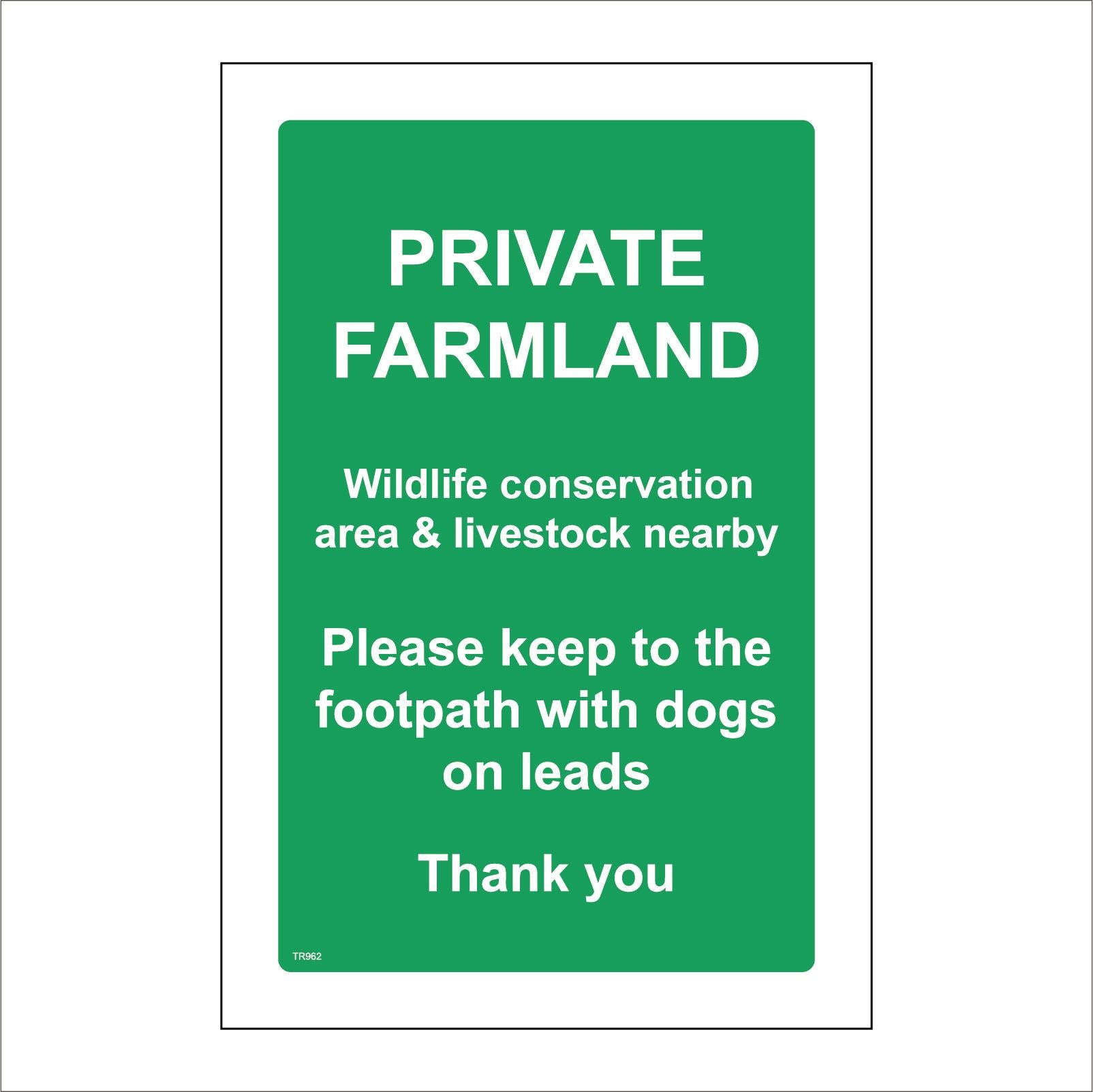 The format of the standard TR962 sign is Billboard Portrait and displays a White /Private Farmland Wildlife Conservation Area Livestock text on a Green Background.