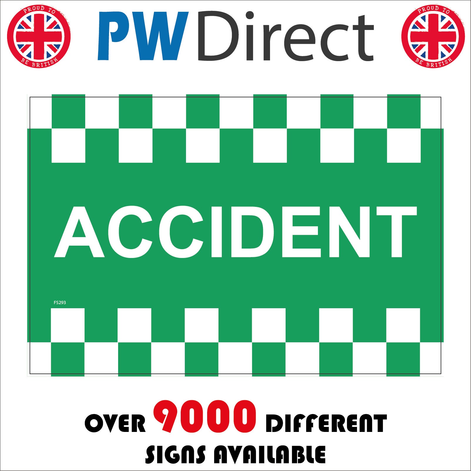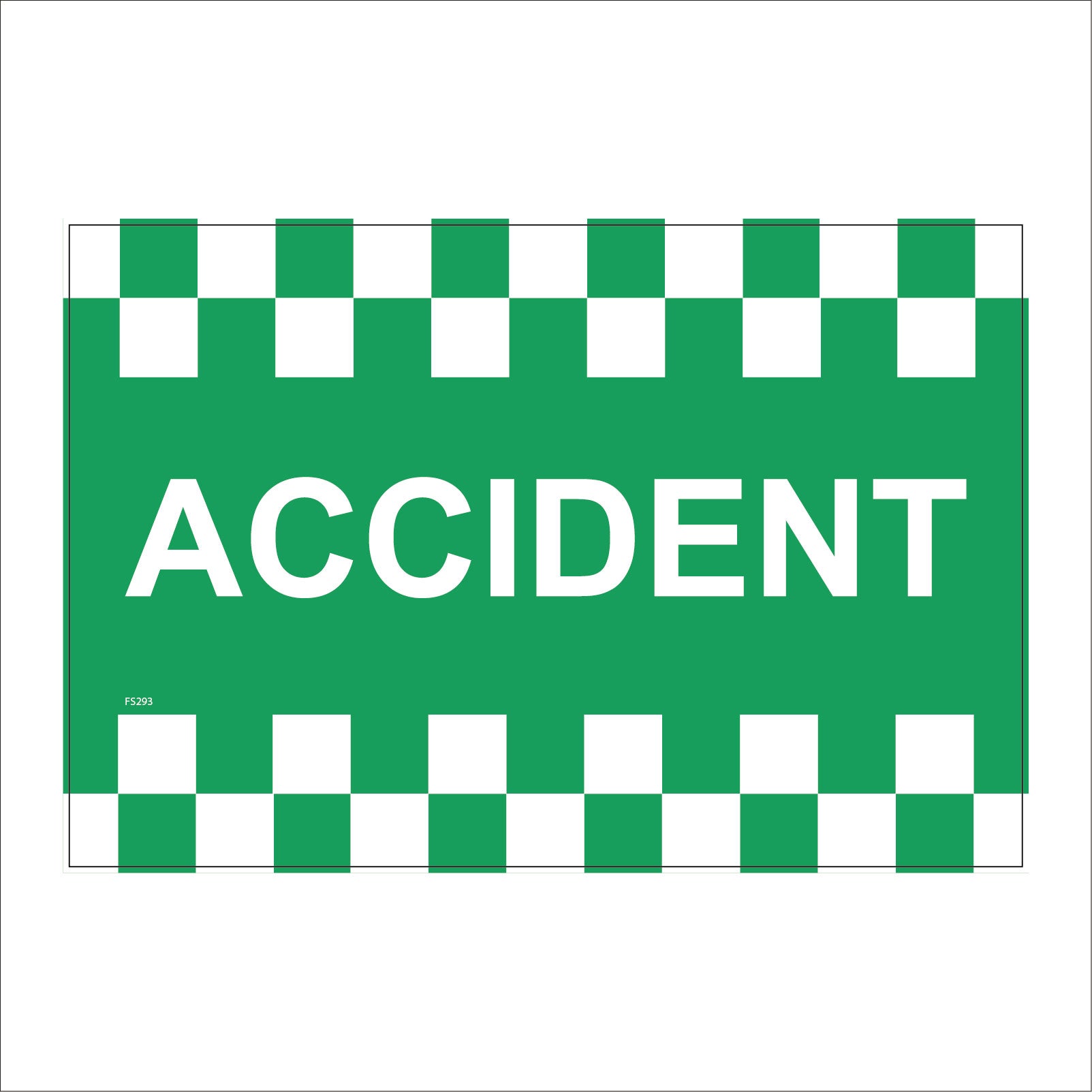 The format of the standard FS293 sign is Billboard Landscape and displays a White /Accident Battenburg Chevrons Warning Traffic Control text on a White/Green Background.