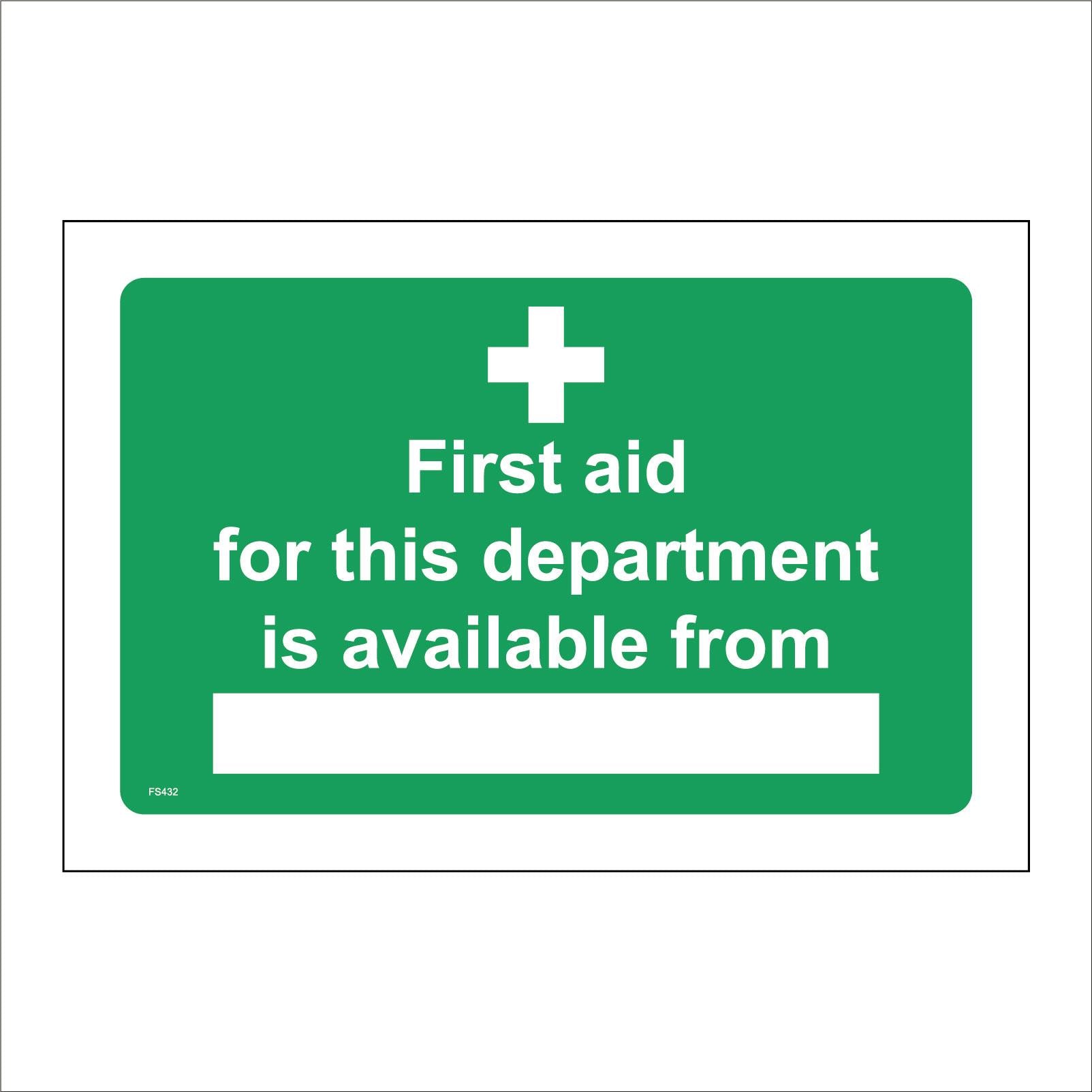 The format of the standard FS432 sign is Billboard Landscape and displays a White White Cross/First Aid Box For This Department Available text on a Green Background.