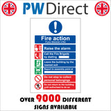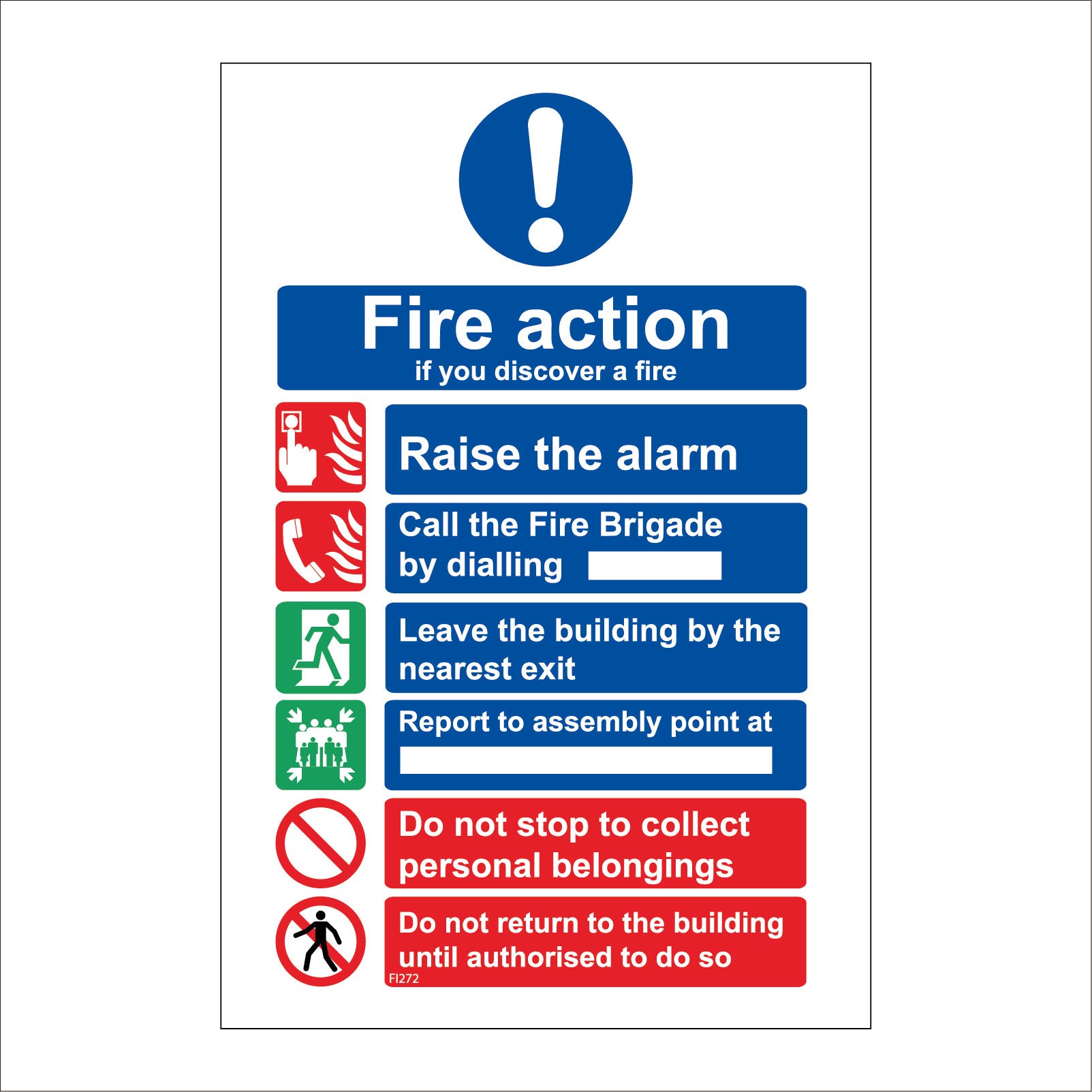 The format of the standard FI272 sign is Billboard Portrait and displays a Blue Circle Exclamation Mark/Fire Action Alarm Brigade Evacuate text on a Red/Blue/Green Background.