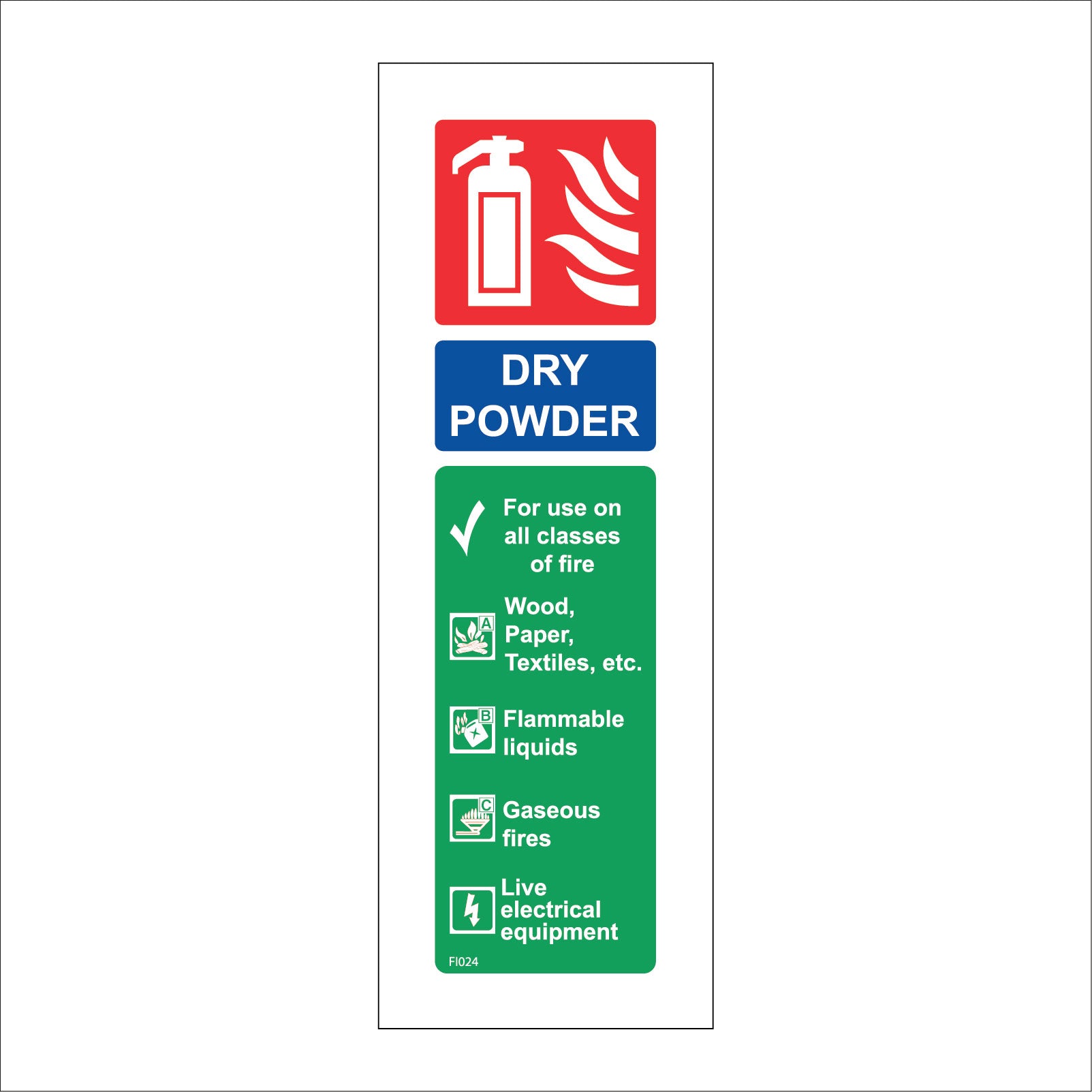 The format of the standard FI024 sign is Long Portrait and displays a White Fire Extinguisher Fire Tick Canister Lighting A/Dry Powder Fire Extinguisher text on a White/Red/Blue/Green Background.