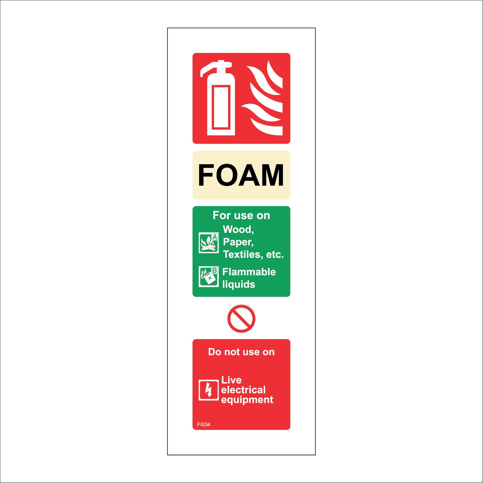 The format of the standard FI034 sign is Long Portrait and displays a White/Black Fire Extinguisher Fire Tick Canister Lighting A/Foam Fire Extinguisher text on a Red/Green/Magnolia Background.