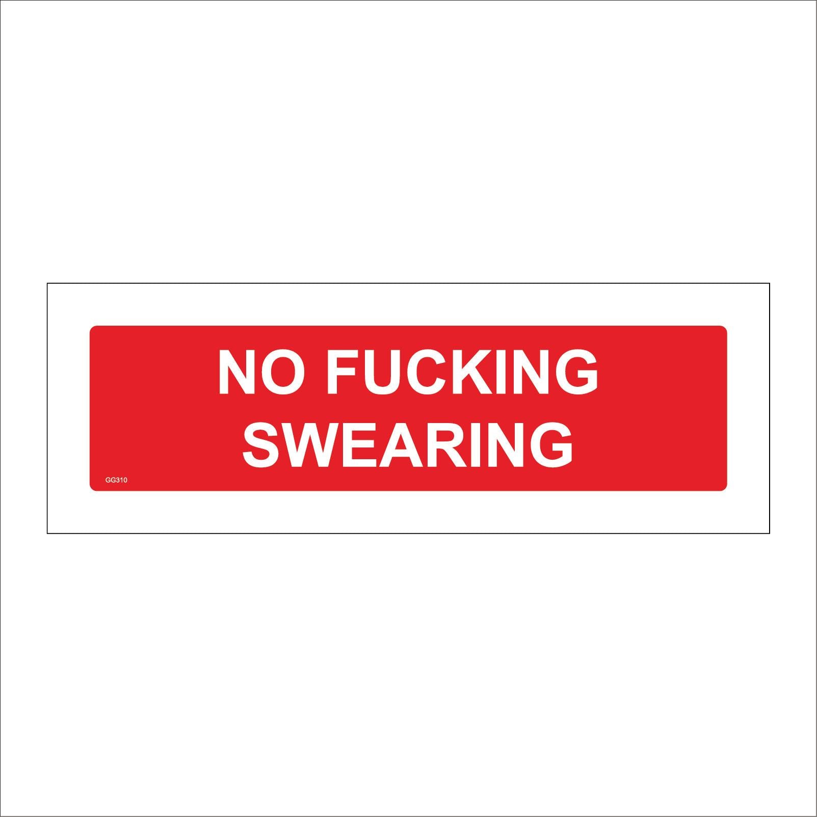 The format of the standard GG310 sign is Long Landscape and displays a White /No Fucking Swearing Four Letter Foul Feck Potty Mouth text on a Red Background.