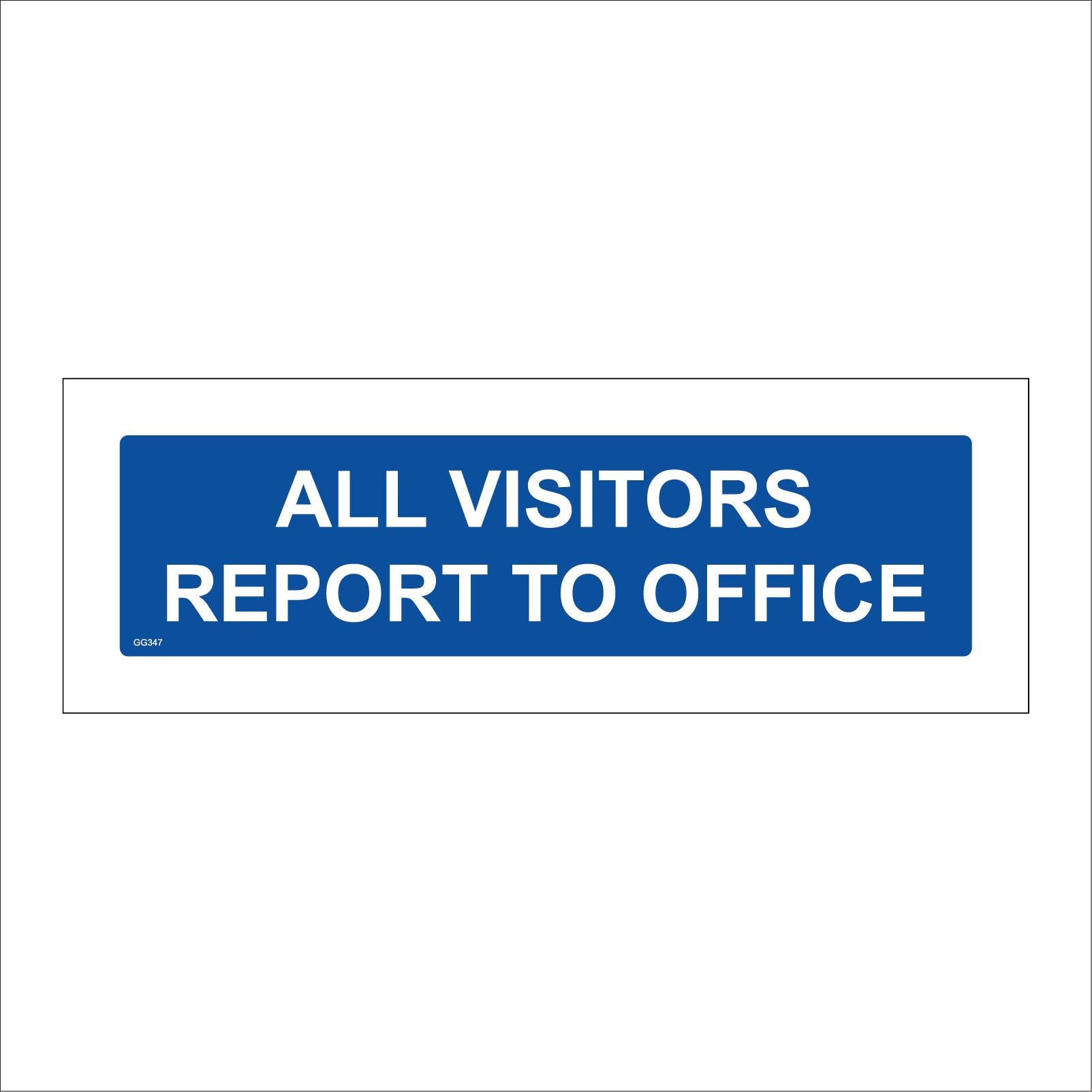 The format of the standard GG347 sign is Long Landscape and displays a White /All Visitors Report To Office White On Blue Plaque text on a Blue Background.