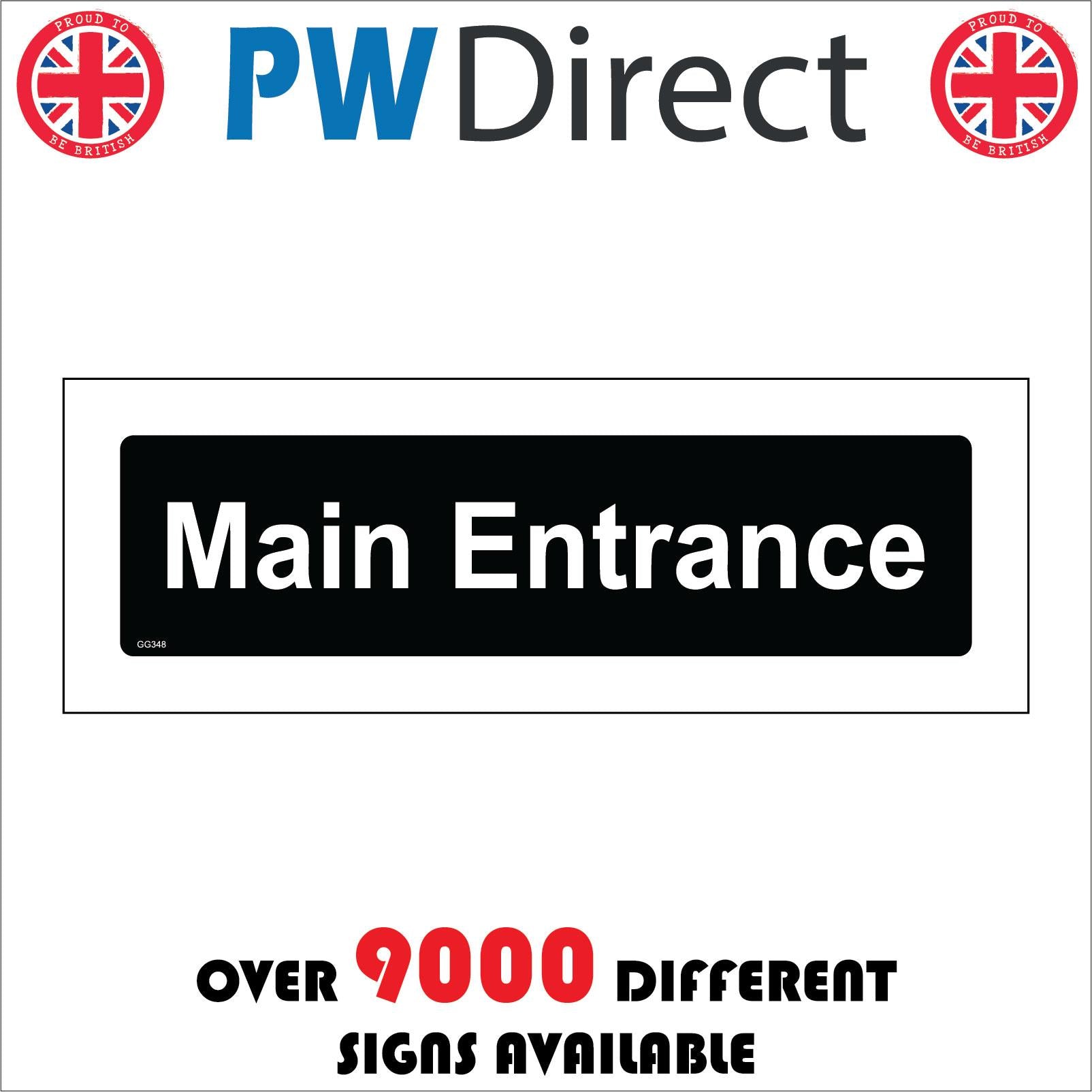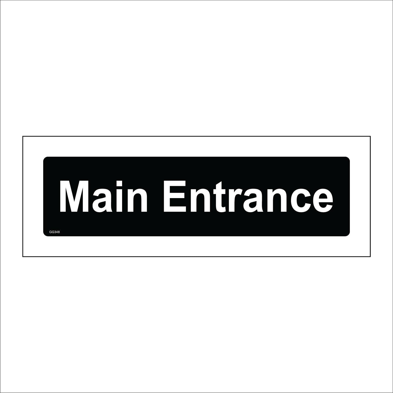 The format of the standard GG348 sign is Long Landscape and displays a White /Main Entrance Front Gate Door Entry text on a Black Background.
