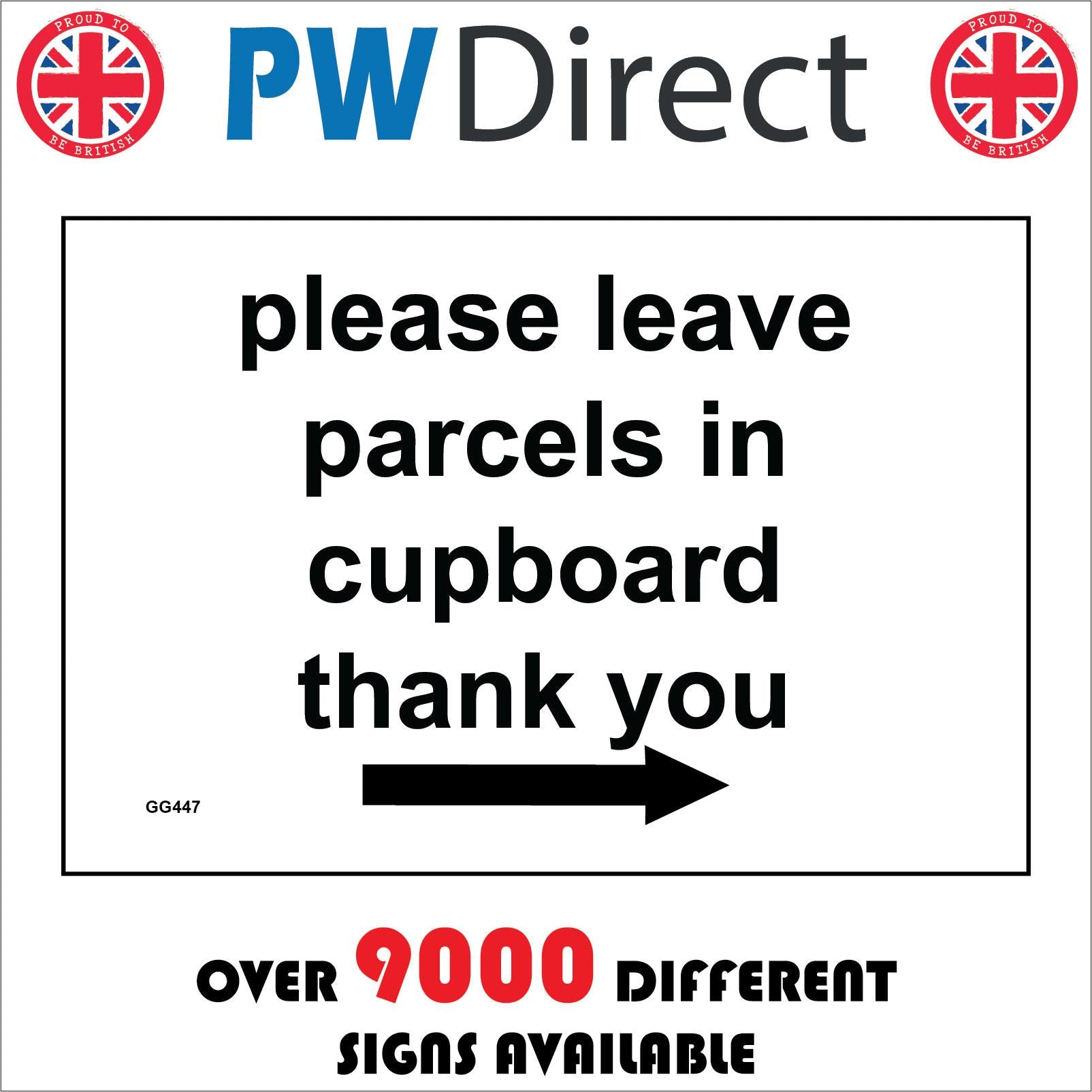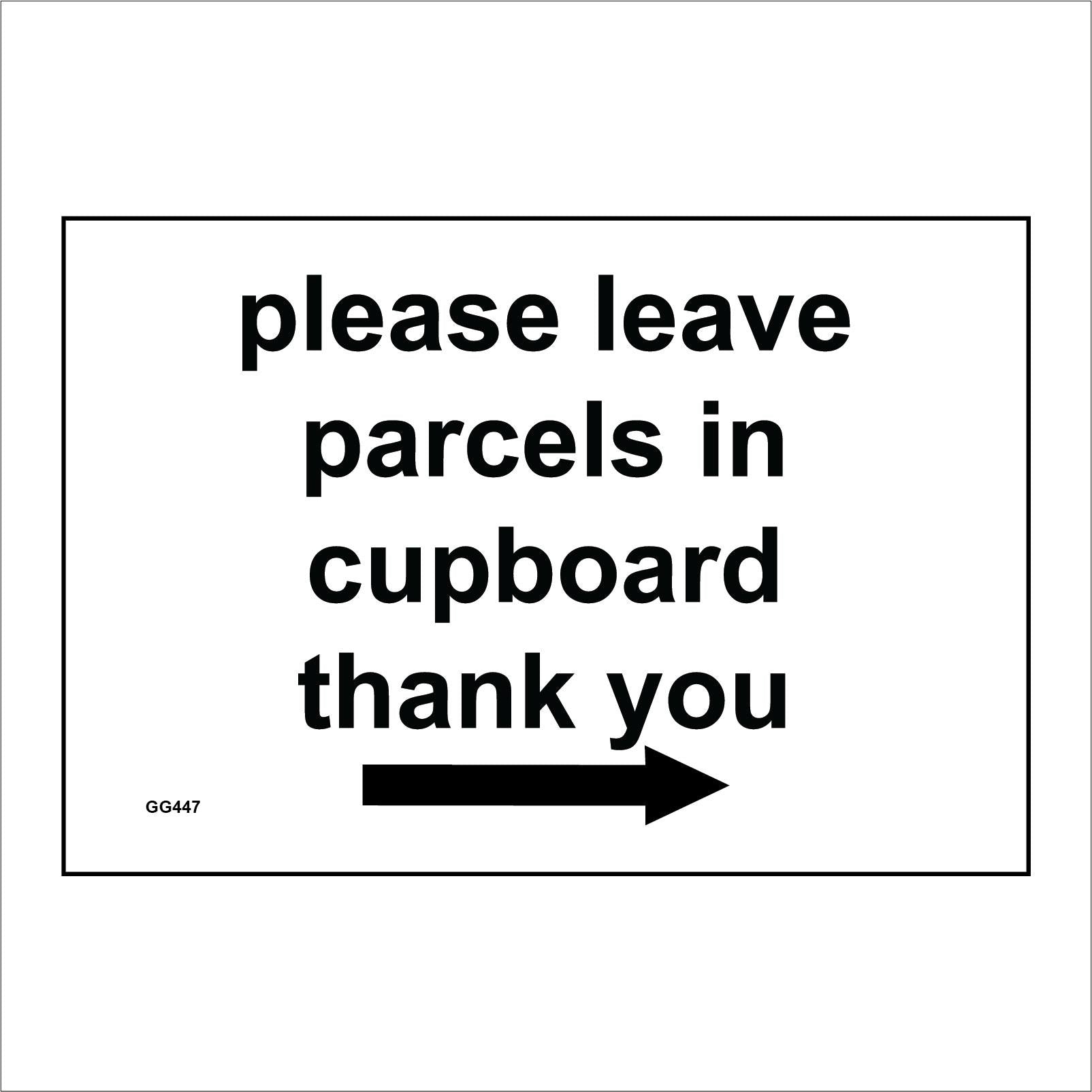 The format of the standard GG447 sign is Billboard Landscape and displays a Black Right Arrow/Please Leave Parcels In Cupboard Right Arrow text on a White Background.