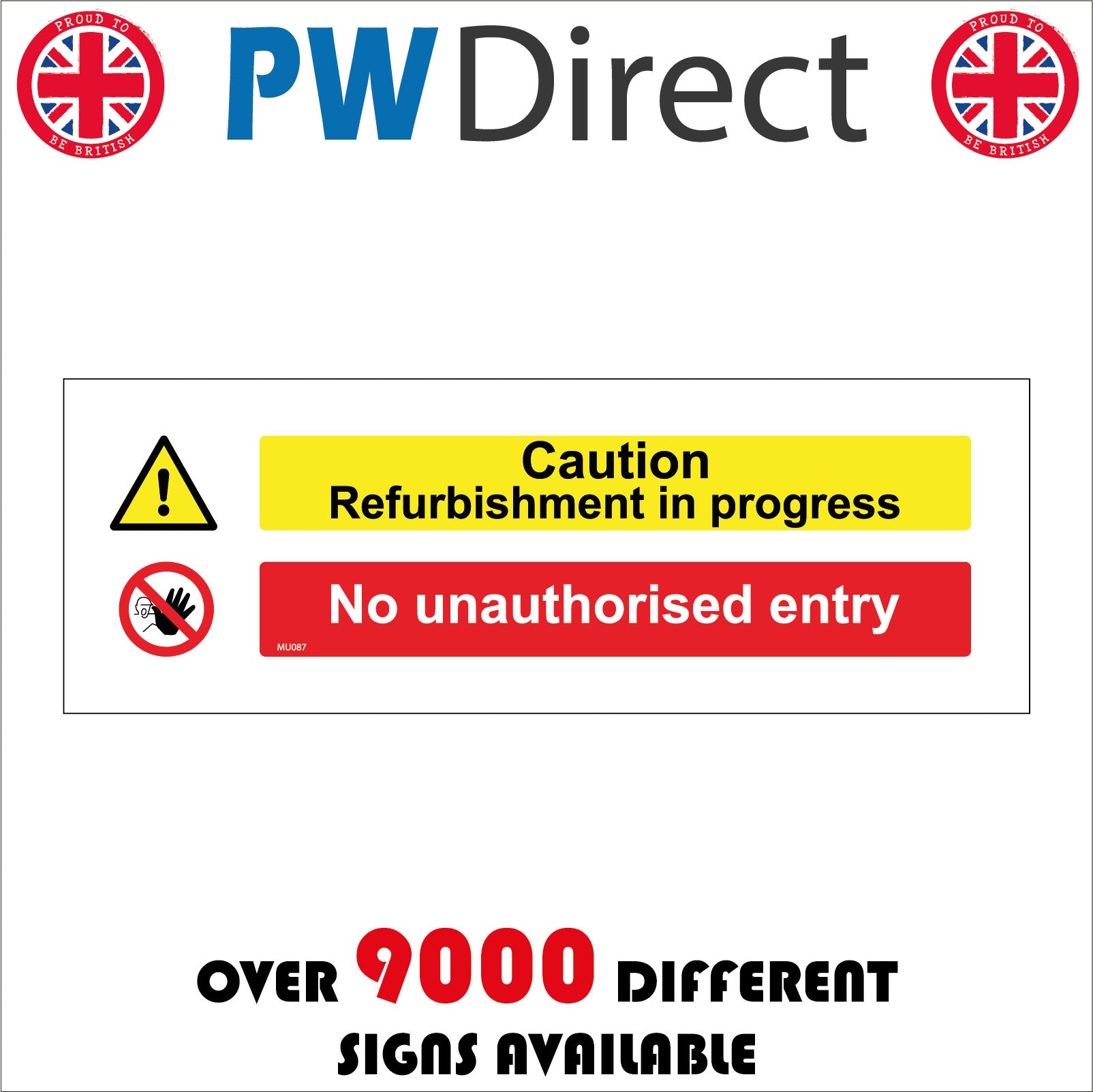 The format of the standard MU087 sign is Long Landscape and displays a Red/Black Triangle Exclamation Mark Circle Hand/Caution Refurbishment In Progress text on a White/Red/Yellow Background.