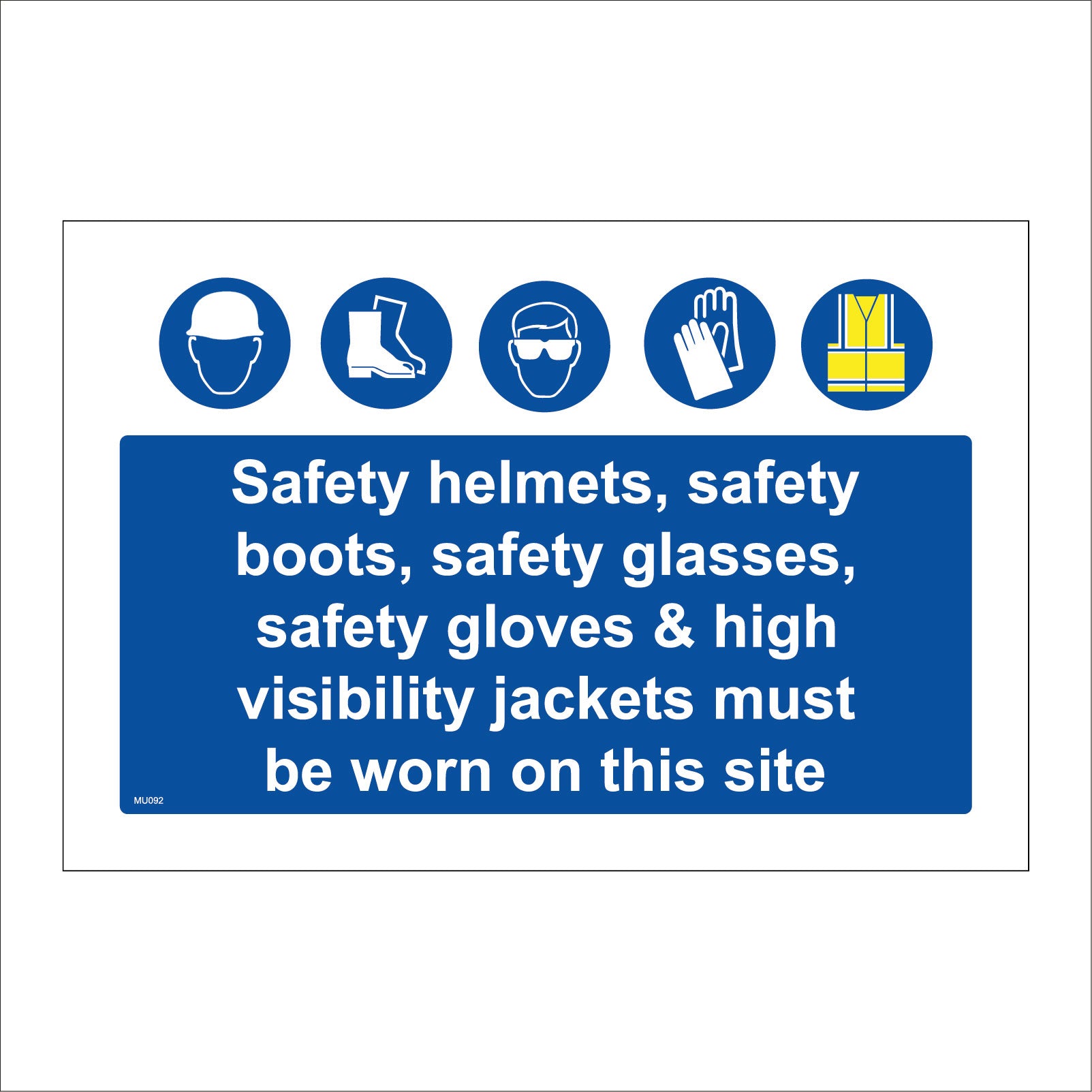 The format of the standard MU092 sign is Billboard Landscape and displays a White/Blue/Yellow Face Hard Hat Boots Glasses Gloves Jacket/Safety Helmets Boots Glasses, Gloves & High Visibility Jackets Must Be Worn On Site text on a White/Blue Background.