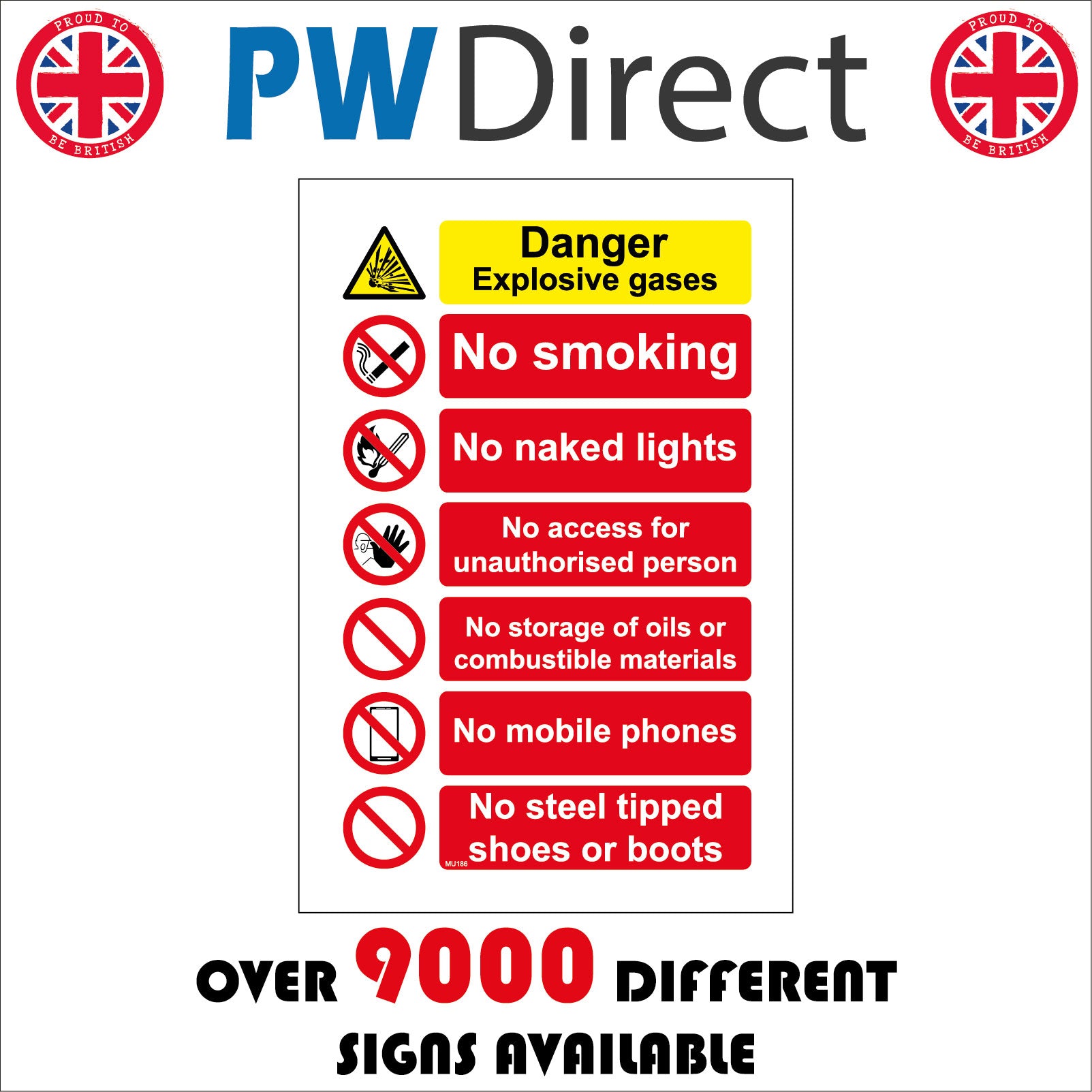 The format of the standard MU186 sign is Billboard Portrait and displays a White/Black 6 Circles Triangle Cigarette Hand Match Phone/Danger Explosive Gases No Smoking No Naked Light No Access For Unauthorised Person text on a Red/Yellow Background.