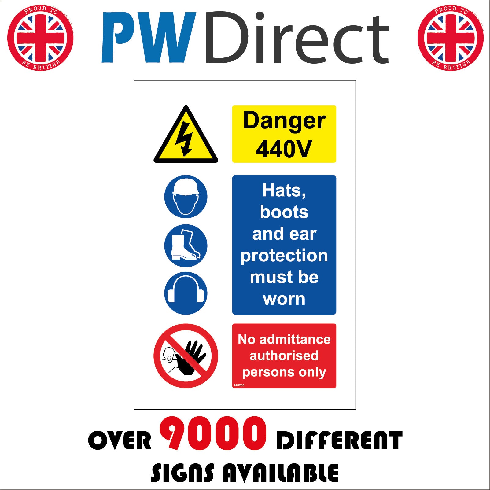 The format of the standard MU200 sign is Billboard Portrait and displays a White/Black Triangle Lightning Bolt 4 Circles Hat Boots Face /Danger 440V Hats, Boots And Ear Protection Must Be Worn No Admittance. Authorised Persons Only text on a Red/Blue/Yellow Background.