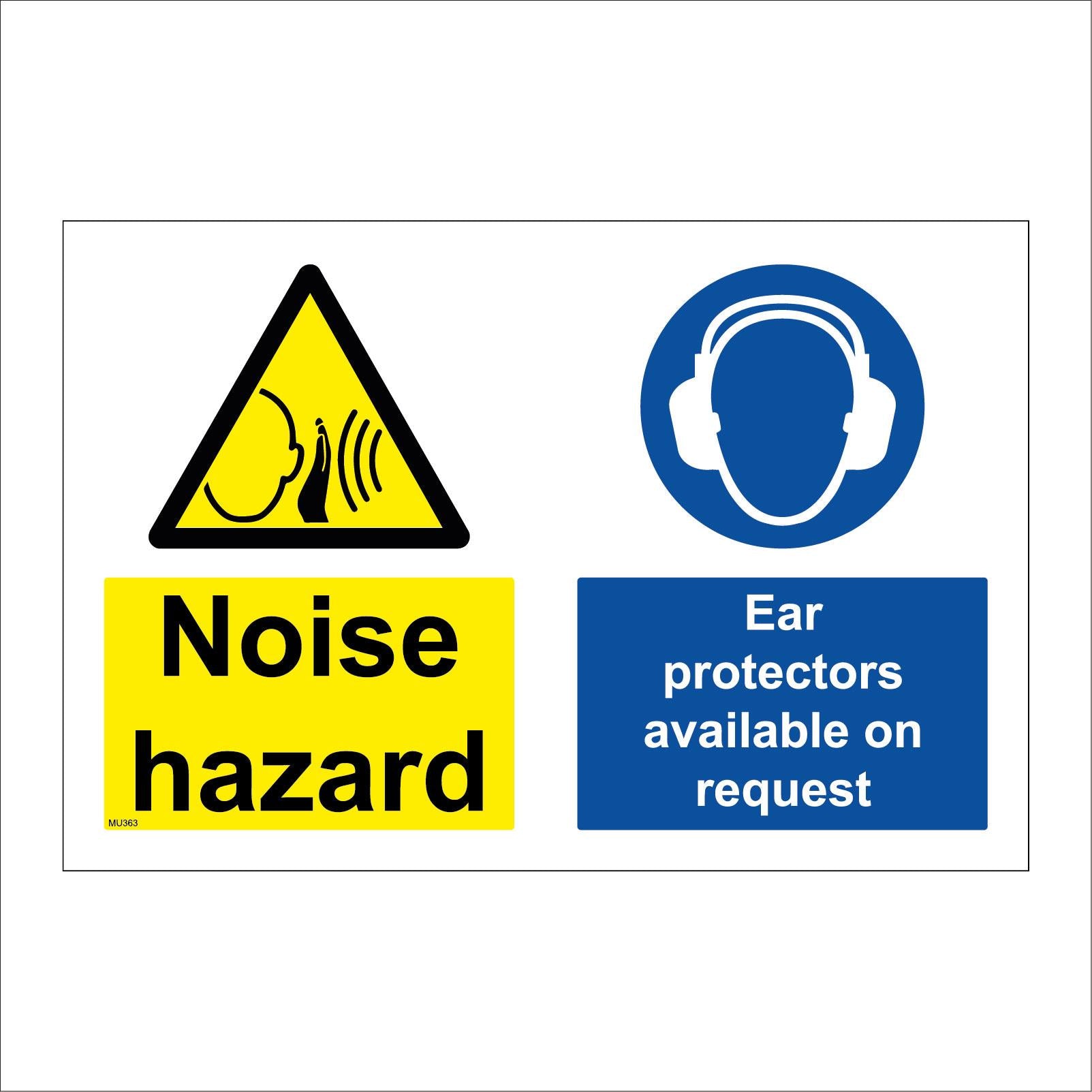 The format of the standard MU363 sign is Billboard Landscape and displays a White/Black Triangle Circle Ear Defenders/Noise Hazard Ear Protectors Available On Request text on a Blue/Yellow Background.