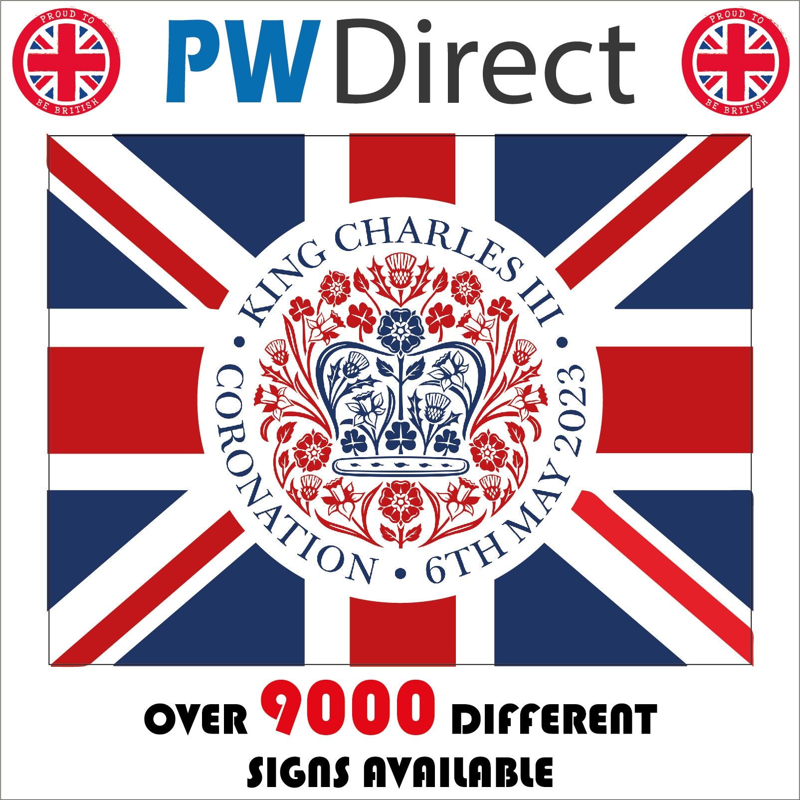 The format of the standard TR678 sign is Billboard Landscape and displays a Red/Blue Crown Flowers Union Jack/King Charles lll Coronation text on a White/Red/Blue Background.