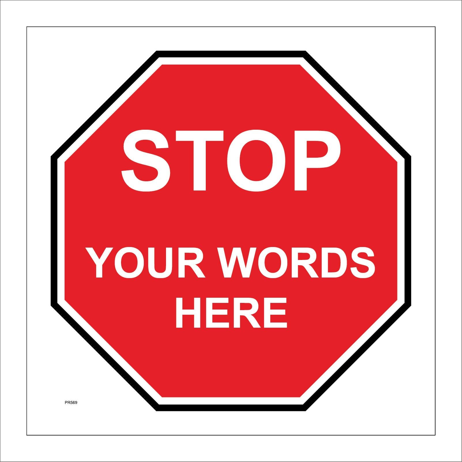 The format of the standard PR569 sign is Square and displays a White /Stop Your Words Here text on a Red Background.