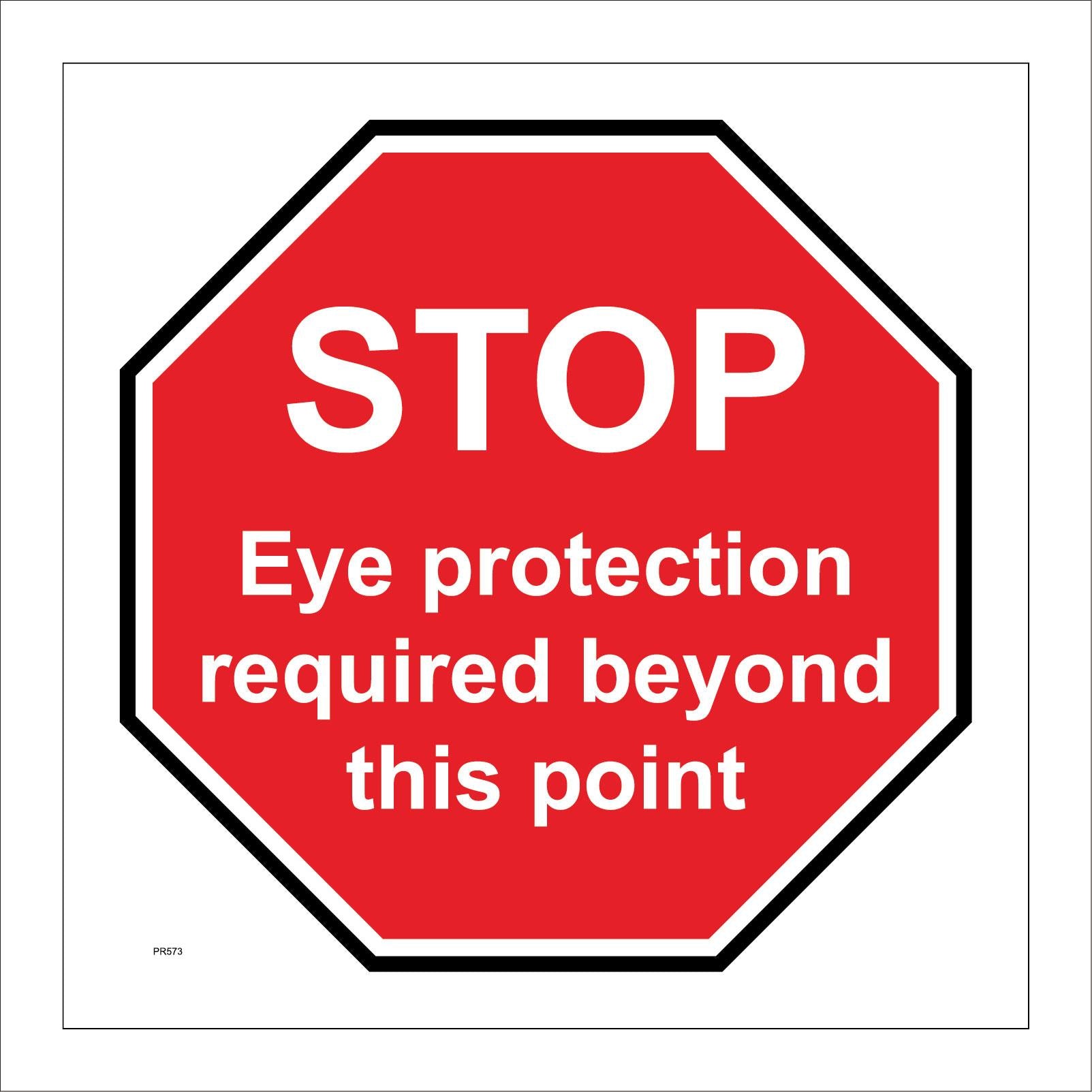 The format of the standard PR573 sign is Square and displays a White /Stop Eye Protection Required Beyond This Point text on a Red Background.