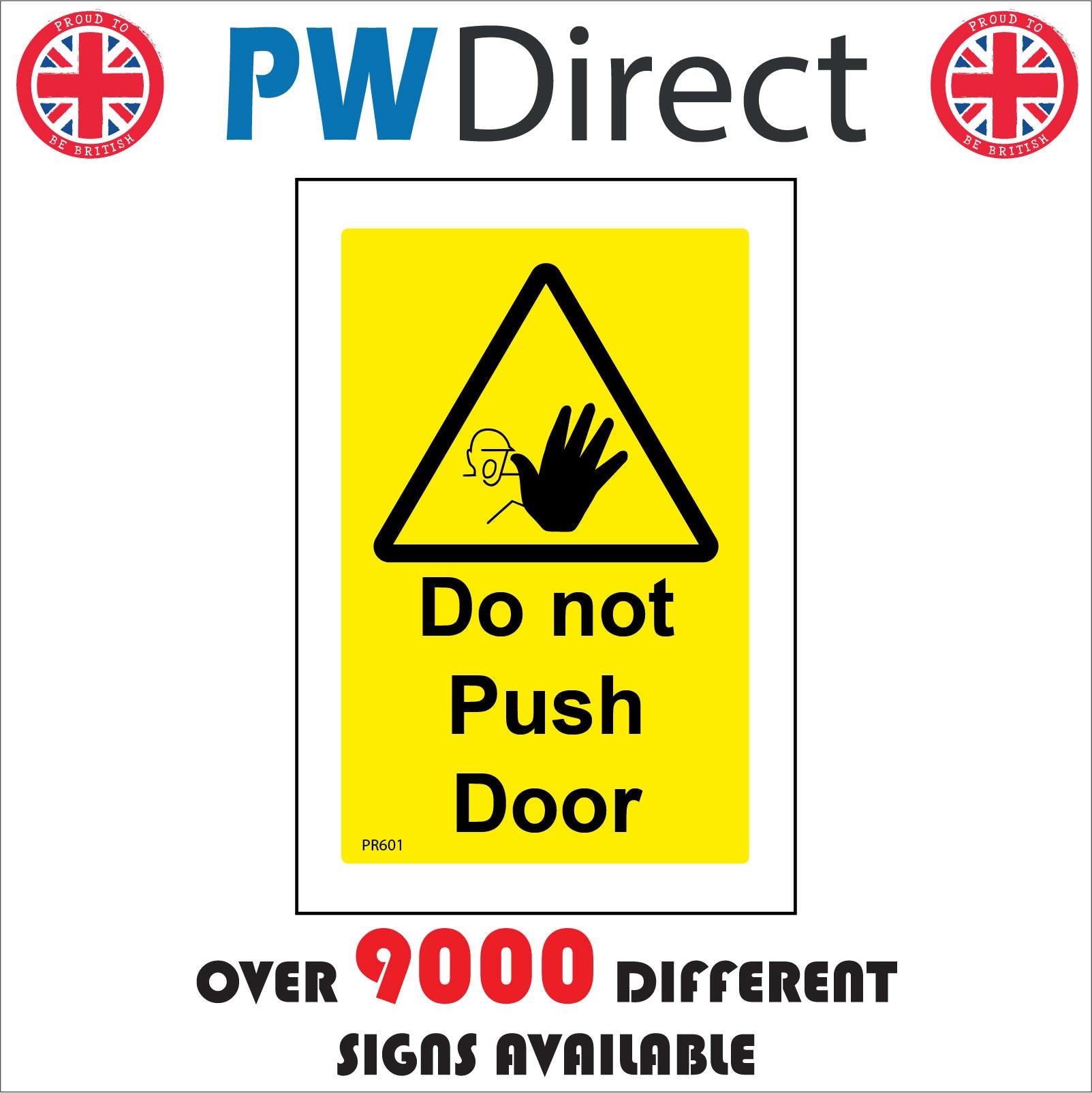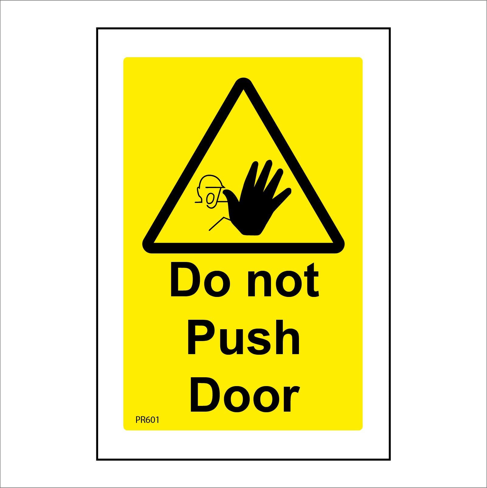 The format of the standard PR601 sign is Billboard Portrait and displays a Black Triangle Hand/Do No Push Door text on a Yellow Background.