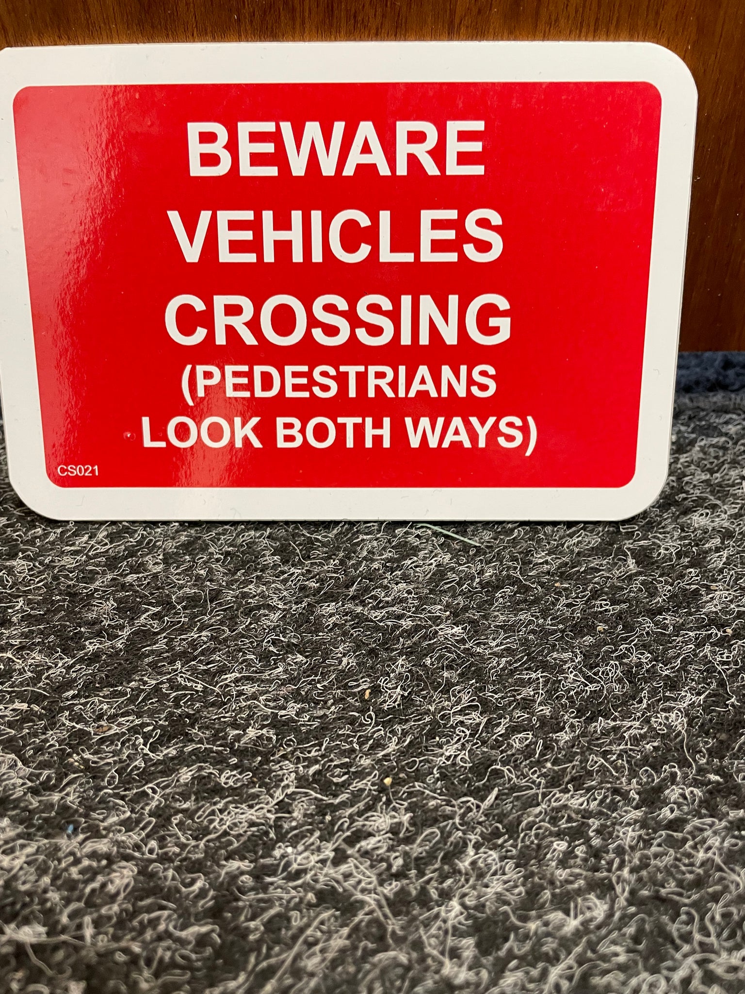 Beware Vehicles Crossing Sign, 150 x 100mm 3mm Foamex Red background white text. RCS021A