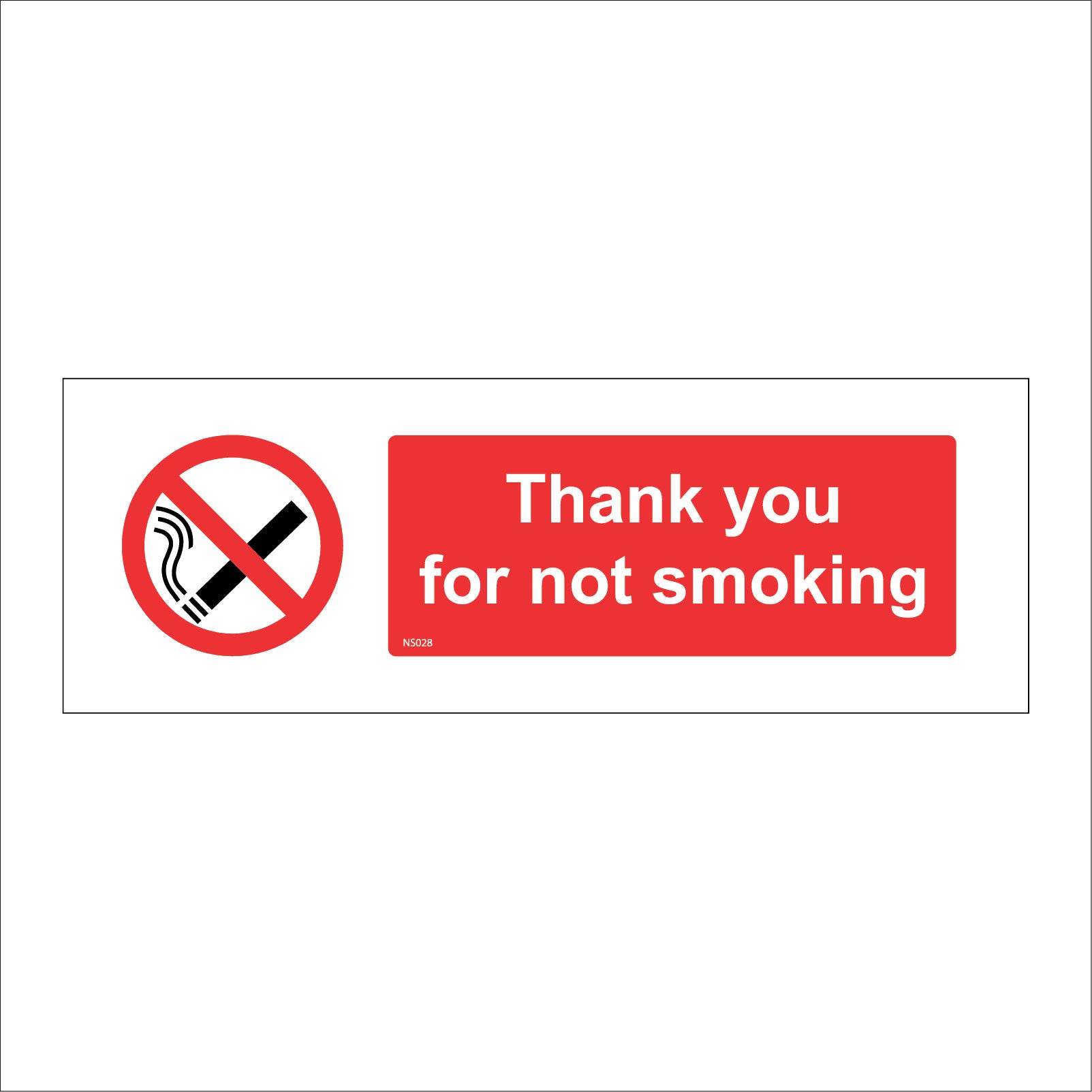 The format of the standard NS028 sign is Long Landscape and displays a White Cigarette/Thank You For Not Smoking text on a Red Background.