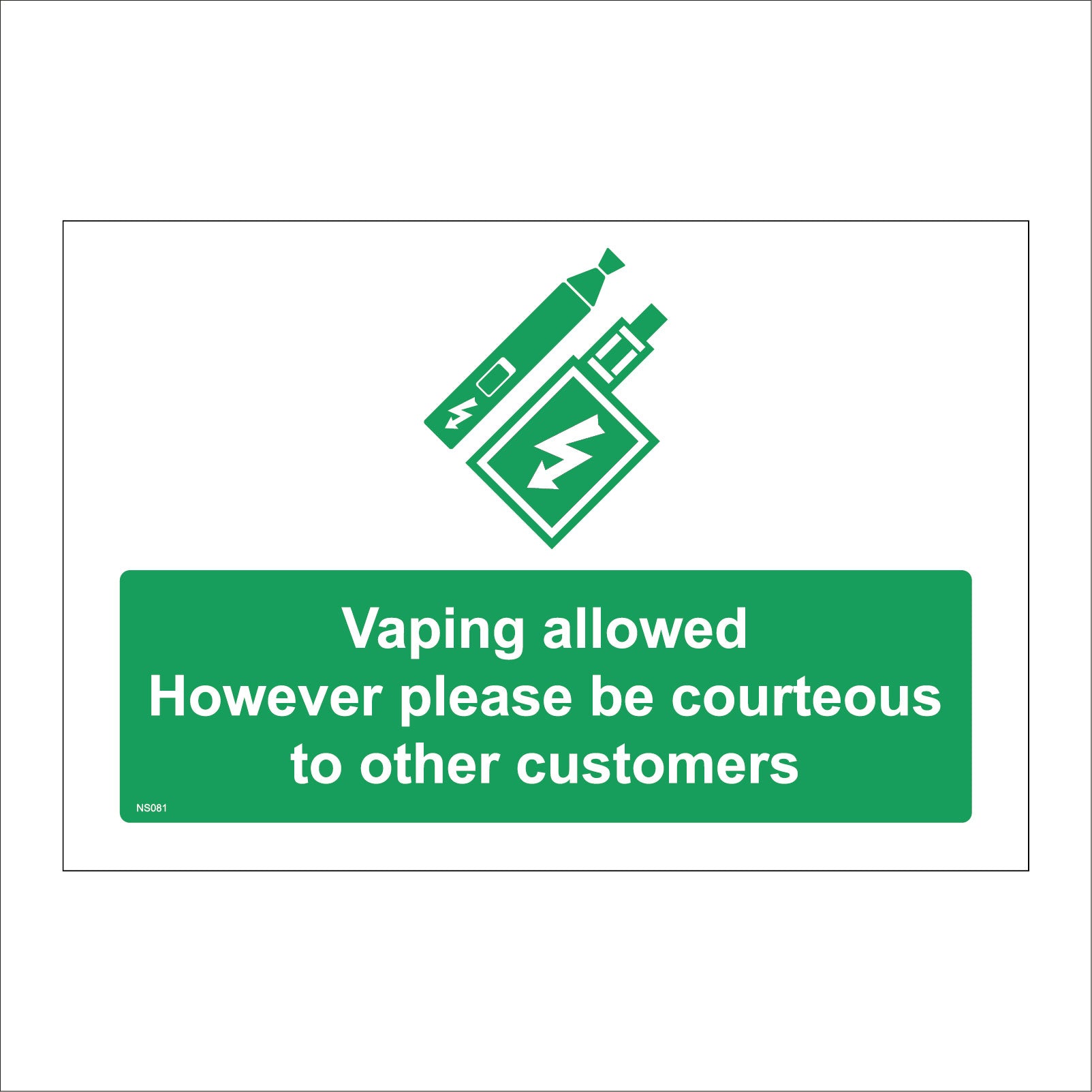 The NS081 Vaping Allowed However Please Be Courteous To Other Customers Sign with E-Cigarette is part of our No Smoking Sign Range.
