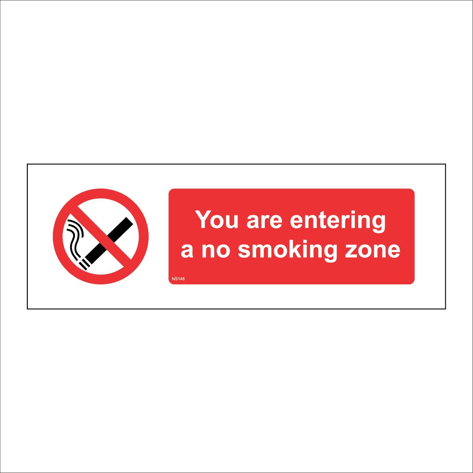 The format of the standard NS148 sign is Long Landscape and displays a White/Red/Black Circle Diagonal Line Cigarette/You Are Entering A No Smoking Zone text on a White/Red Background.