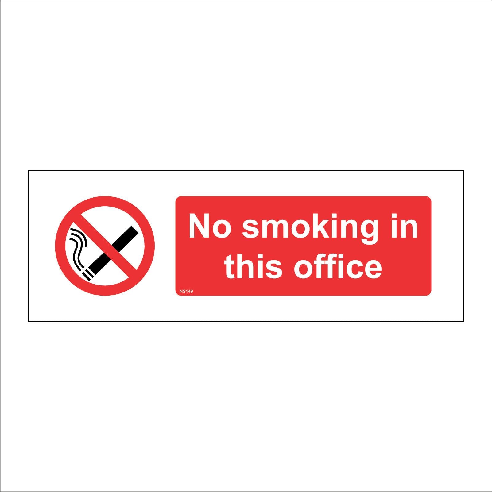 The format of the standard NS149 sign is Long Landscape and displays a White/Red/Black Circle Diagonal Line Cigarette/No Smoking In This Office text on a White/Red Background.