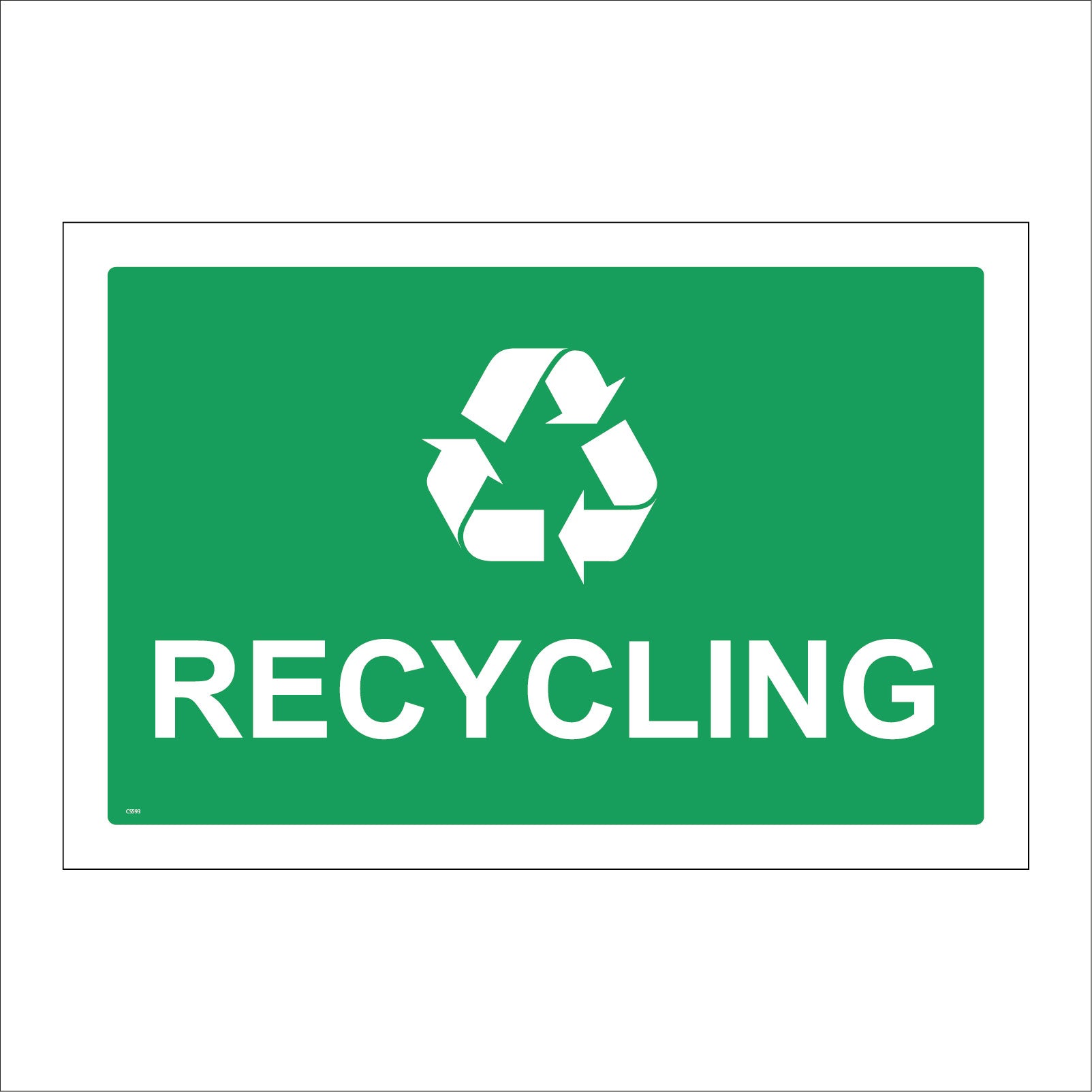 The format of the standard CS593 sign is Billboard Landscape and displays a White Recycling Logo/Recycling Bin Rubbish Waste Green Refuse Planet Skip text on a Green Background.