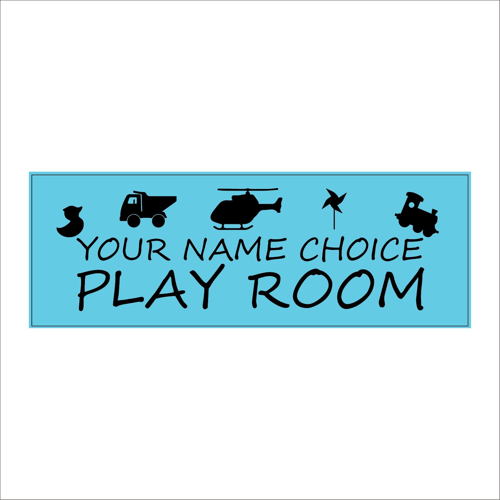 The format of the standard CM307 sign is Long Landscape and displays a Black Truck Train Helicopter Duck Windmill/Childs Name Play Room Door Plaque Nursery Gift Personalise Choose text on a Blue Background.