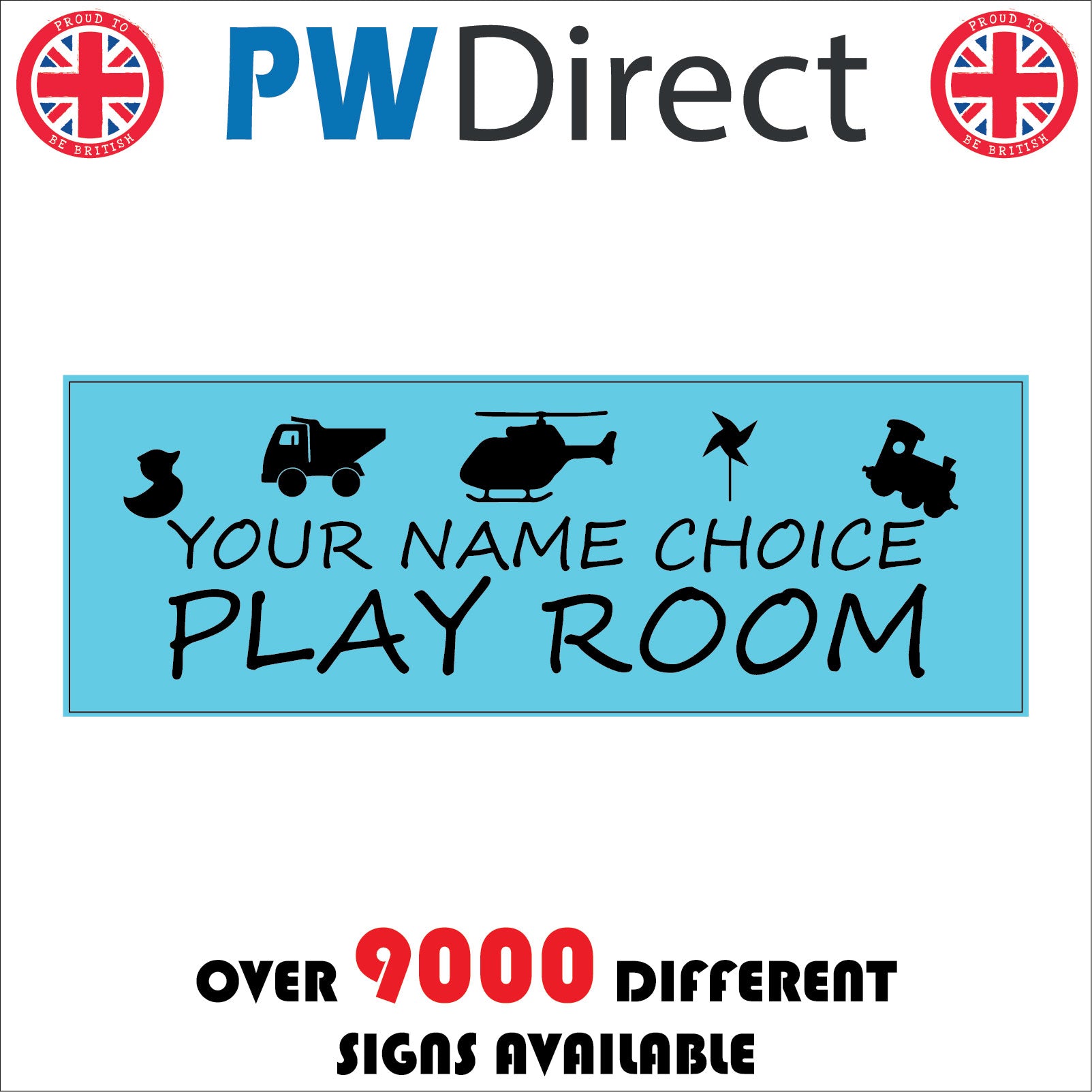 The CM307 Childs Name Play Room Door Plaque Nursery Gift Personalise Choose Sign with Truck Train Helicopter Duck Windmill is part of our Custom Sign Range.
