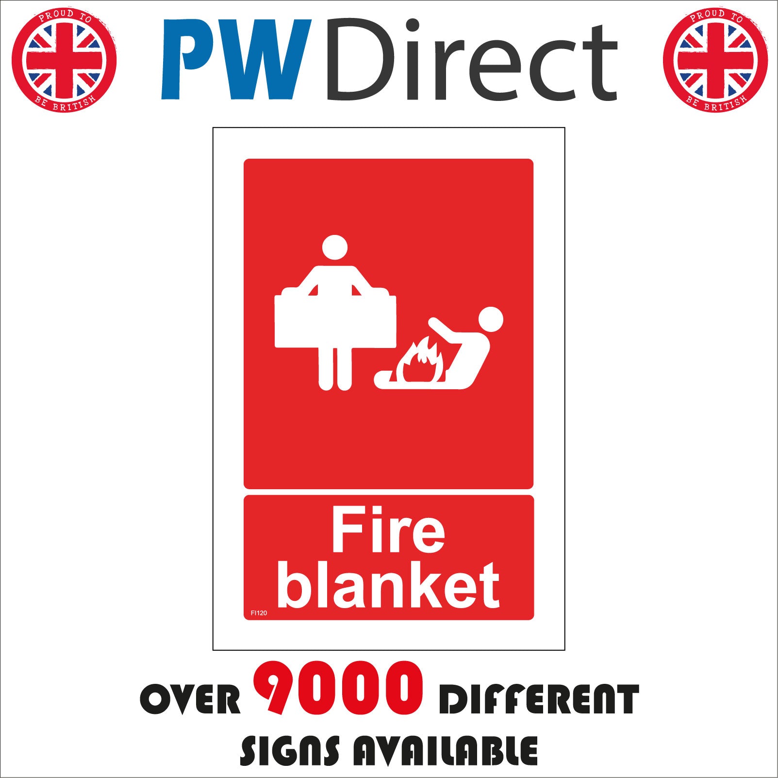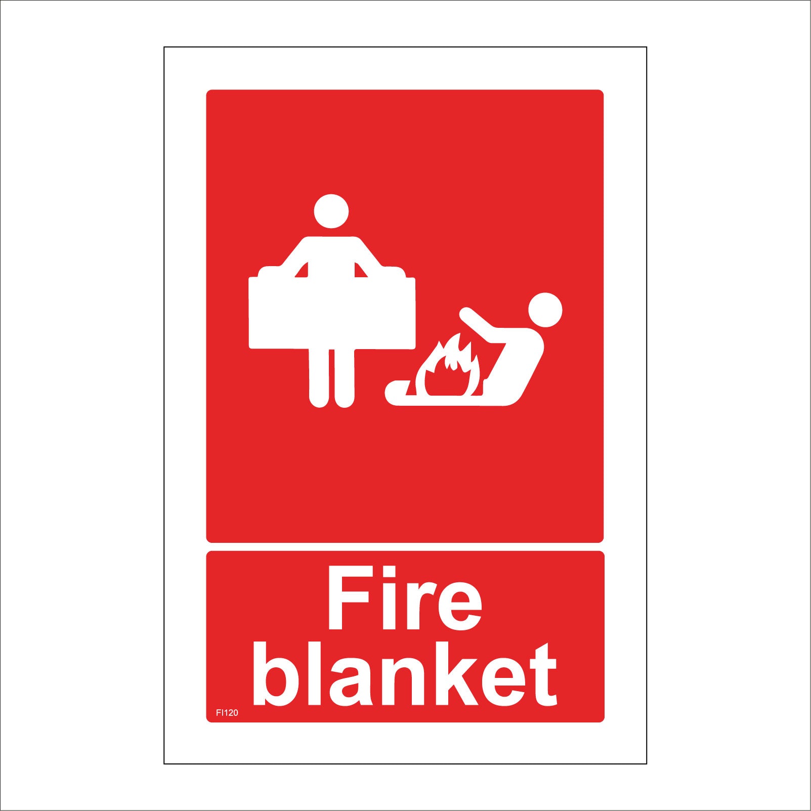 The format of the standard FI120 sign is Billboard Portrait and displays a White People Fire Fire Blanket/Fire Blanket text on a Red Background.