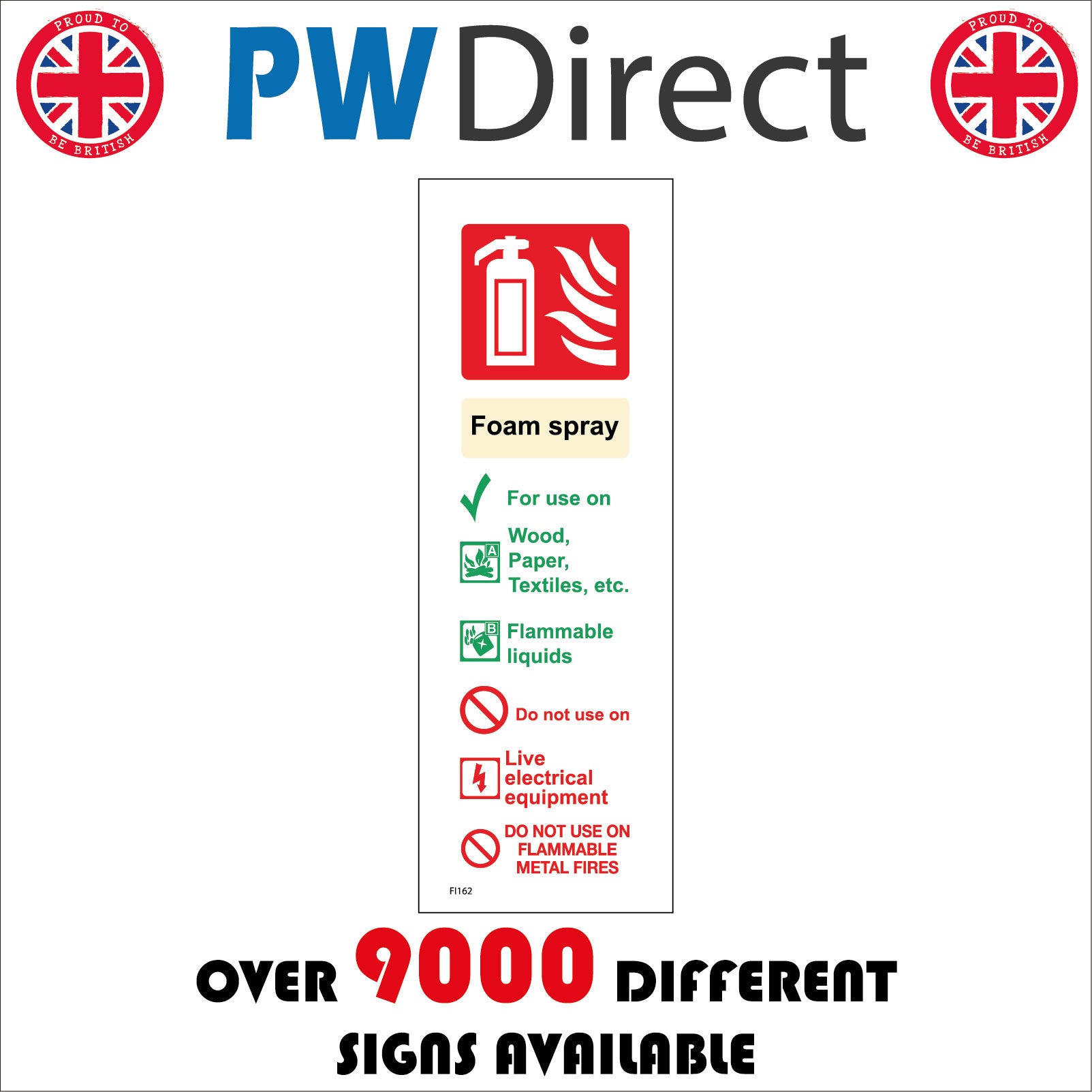 The format of the standard FI162 sign is Long Portrait and displays a Red/Green/Black Fire Can Gas Lightning Bolt/Foam Spray Safe For Use On Wood, Paper Textiles Etc. Safe For Use On Flammable Fires text on a White/Red Background.