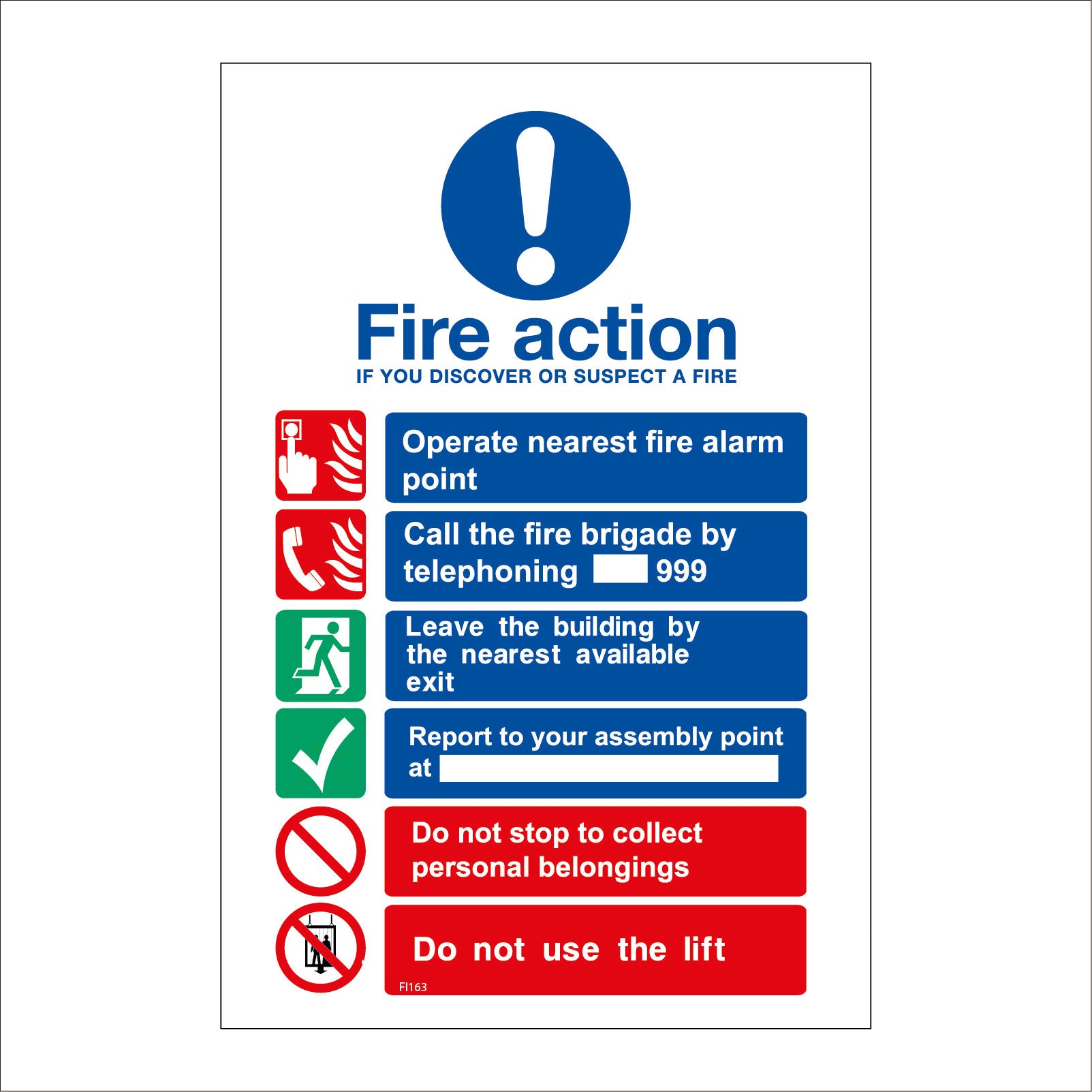 The format of the standard FI163 sign is Billboard Portrait and displays a White/Blue Circle Exclamation Mark Hand Fire,People Phone/Fire Action If You Discover Or Suspect A Fire. Operate Nearest Fire Alarm Point text on a Red/Blue/Green Background.