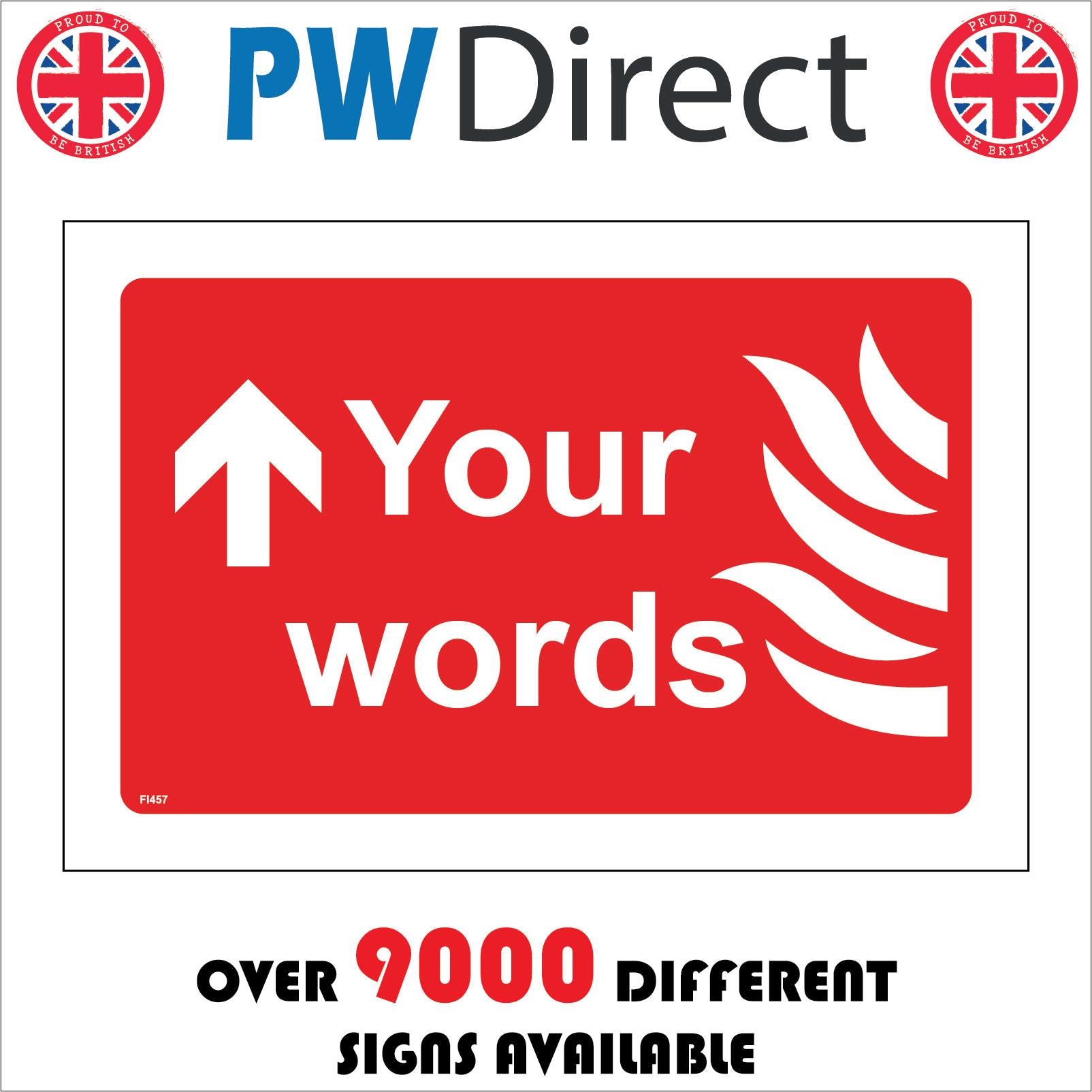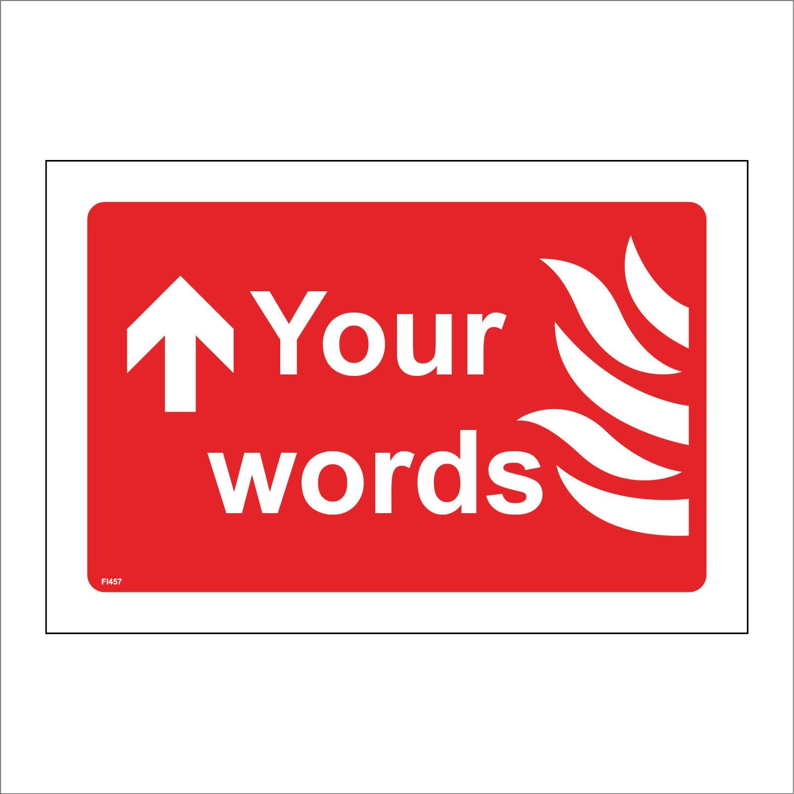 The format of the standard FI457 sign is Billboard Landscape and displays a White Up Arrow Flames/Fire Bucket Ahead Up Arrow Your Choice Custom Taylormade text on a Red Background.