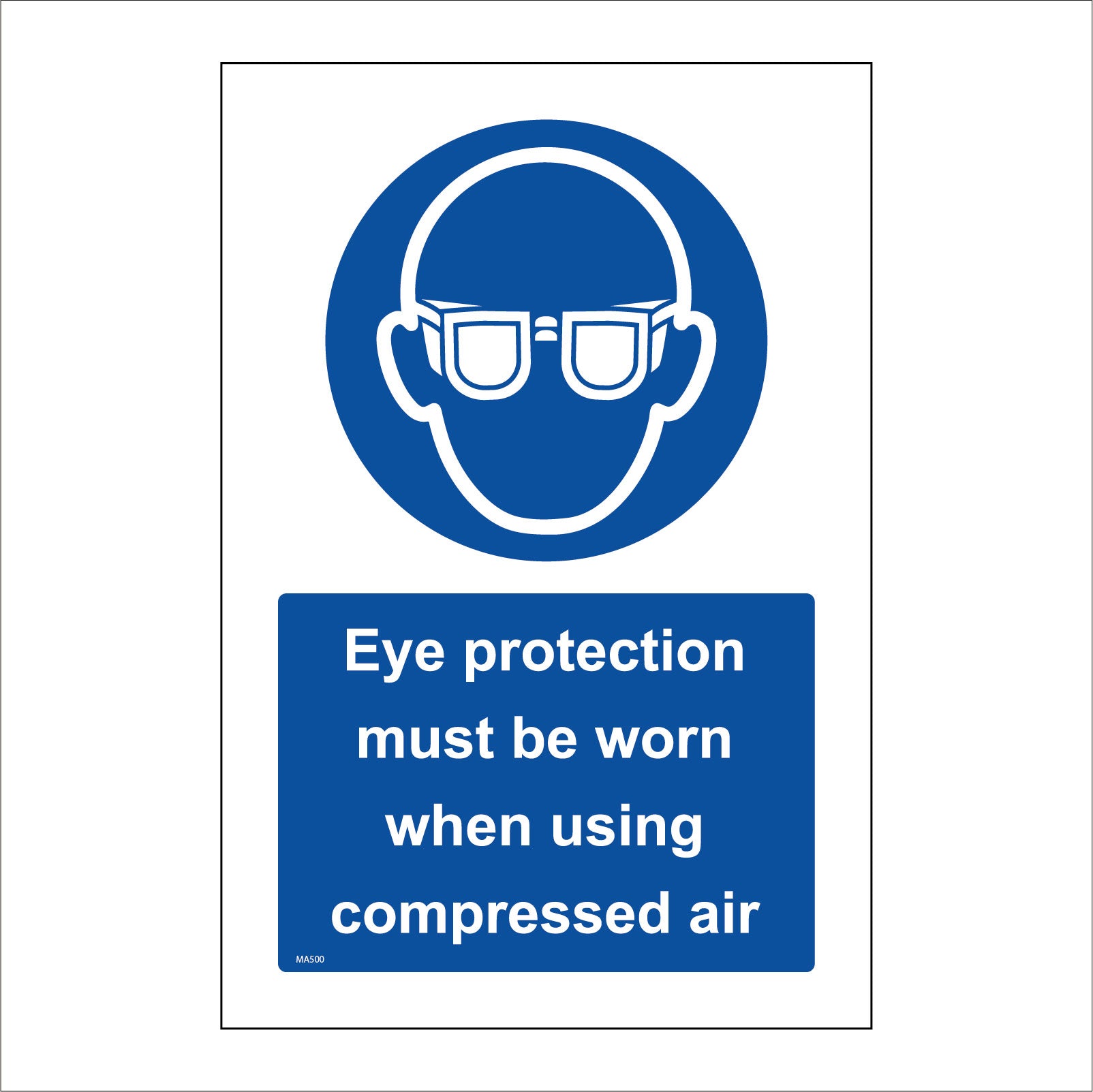 The format of the standard MA500 sign is Billboard Portrait and displays a White Circle Face Glasses/Eye Protection Must Be Worn When Using Compressed Air text on a Blue Background.