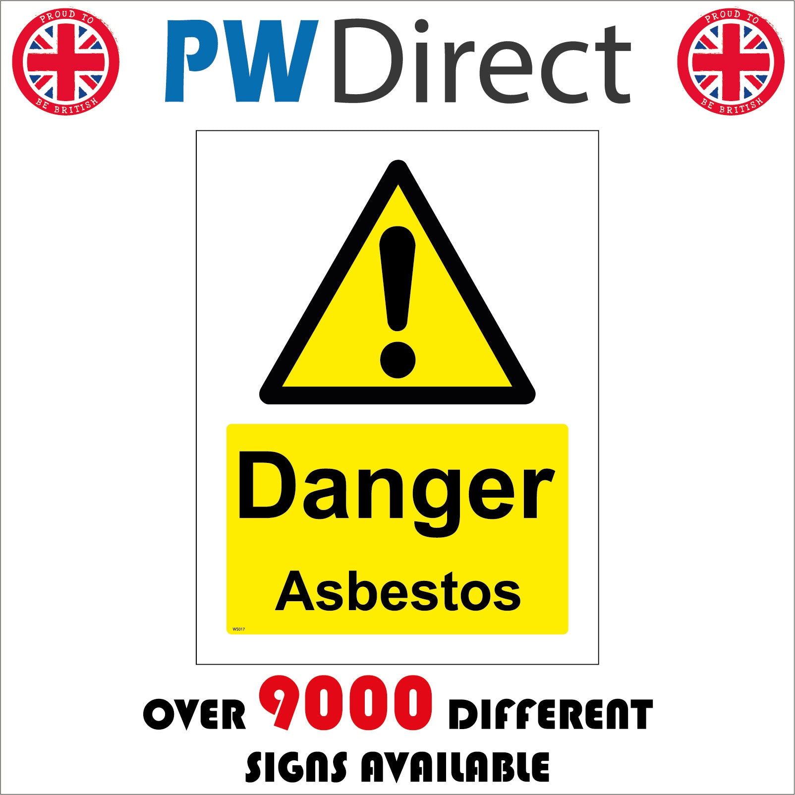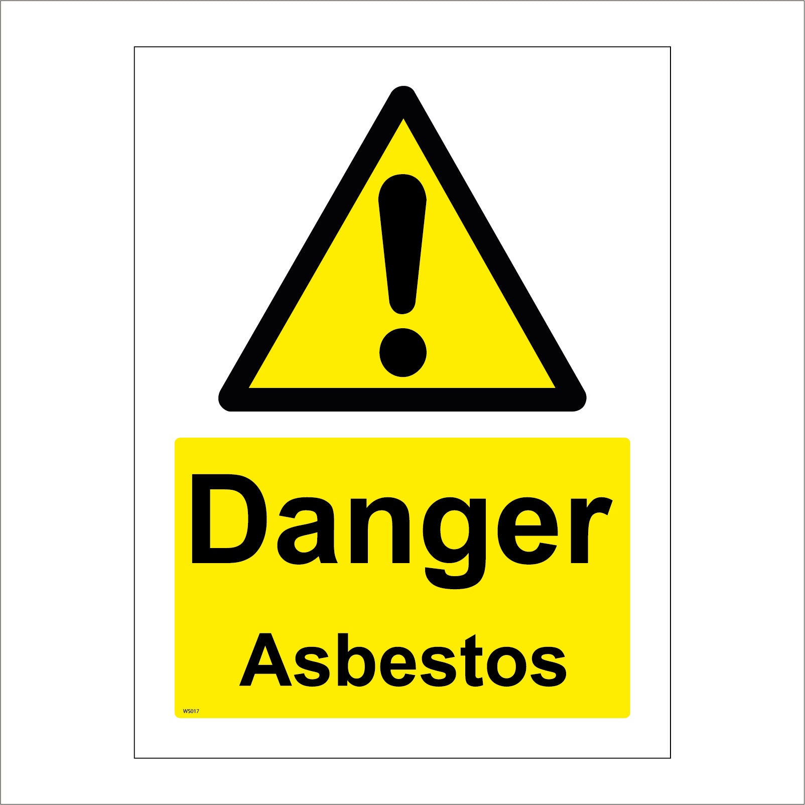 The format of the standard WS017 sign is Billboard Portrait and displays a Black Triangle Exclamation Mark /Danger Asbestos text on a Yellow Background.