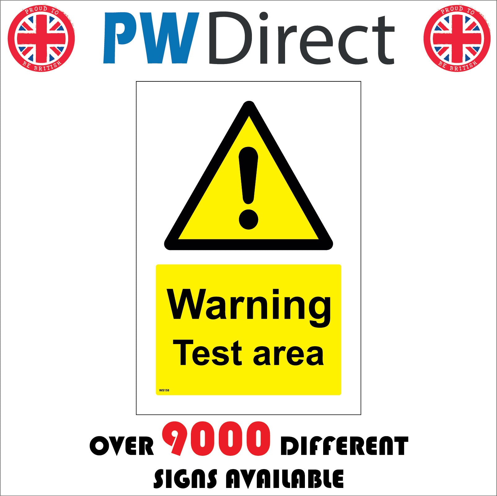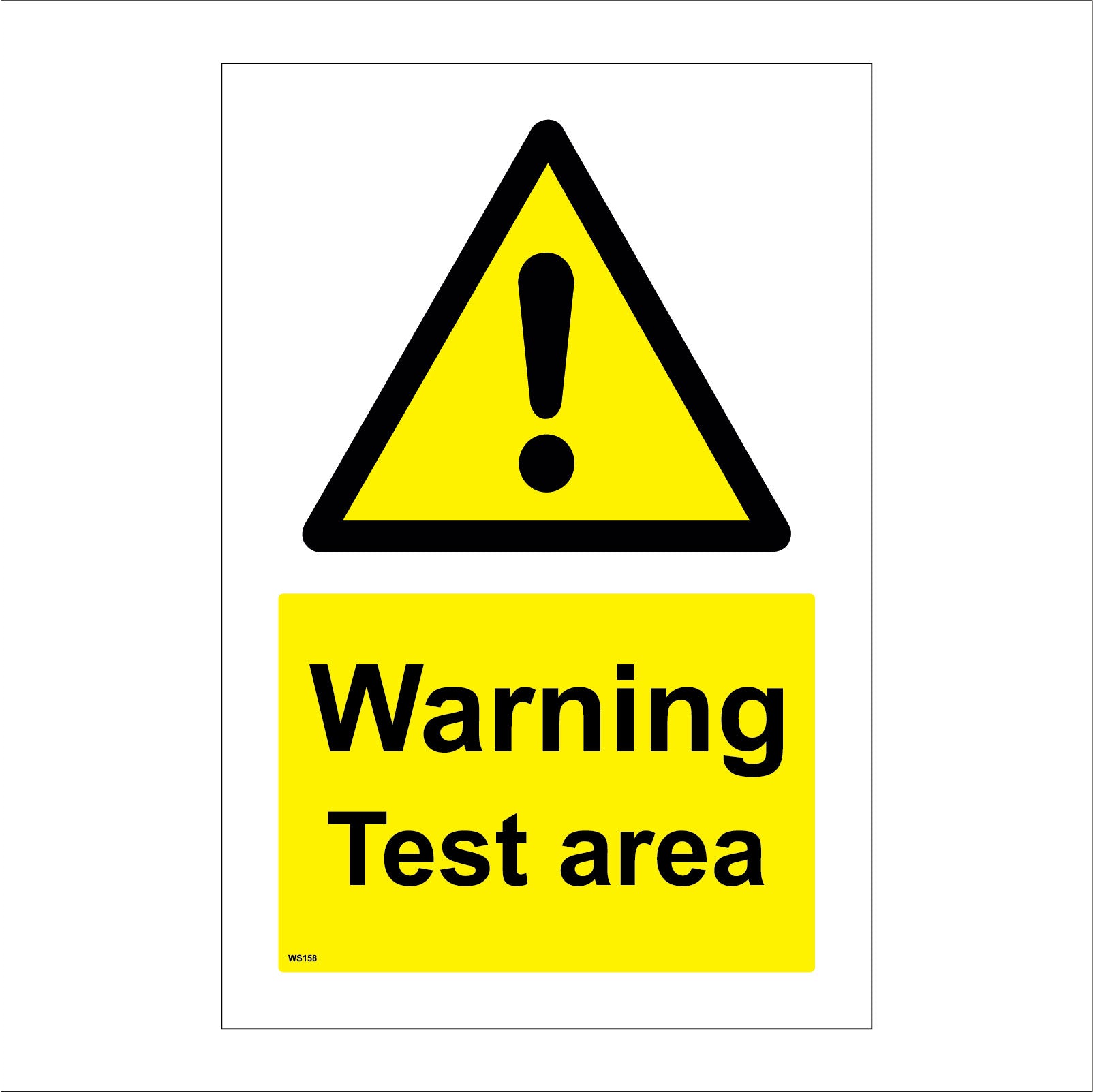The format of the standard WS158 sign is Billboard Portrait and displays a Black Triangle Exclamation Mark /Warning Test Area text on a Yellow Background.