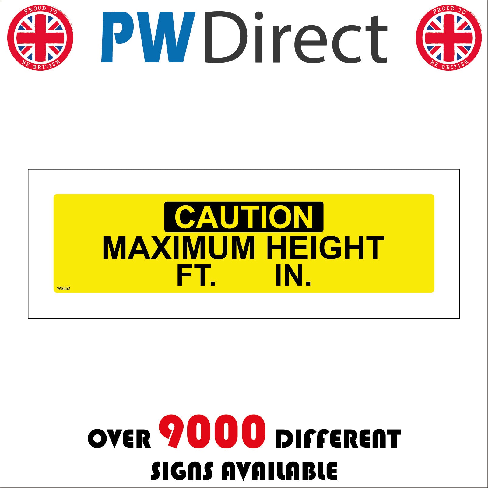 The format of the standard WS552 sign is Long Landscape and displays a Yellow/Black -/Caution Maximum Height text on a Yellow/Black Background.