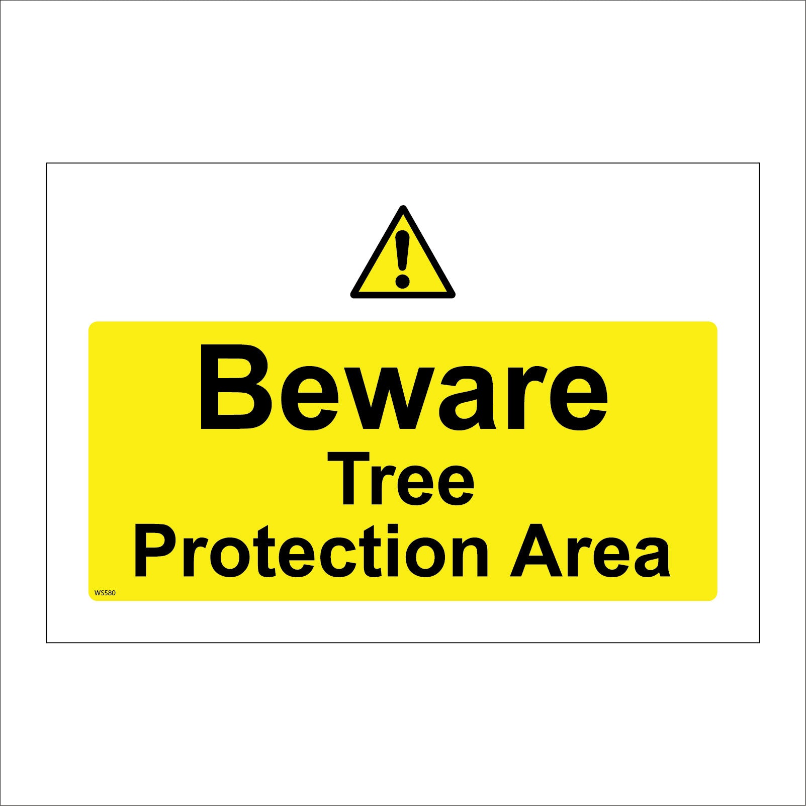The format of the standard WS580 sign is Billboard Landscape and displays a Black Triangle Exclamation Mark /Beware Tree Protection Area text on a Yellow Background.
