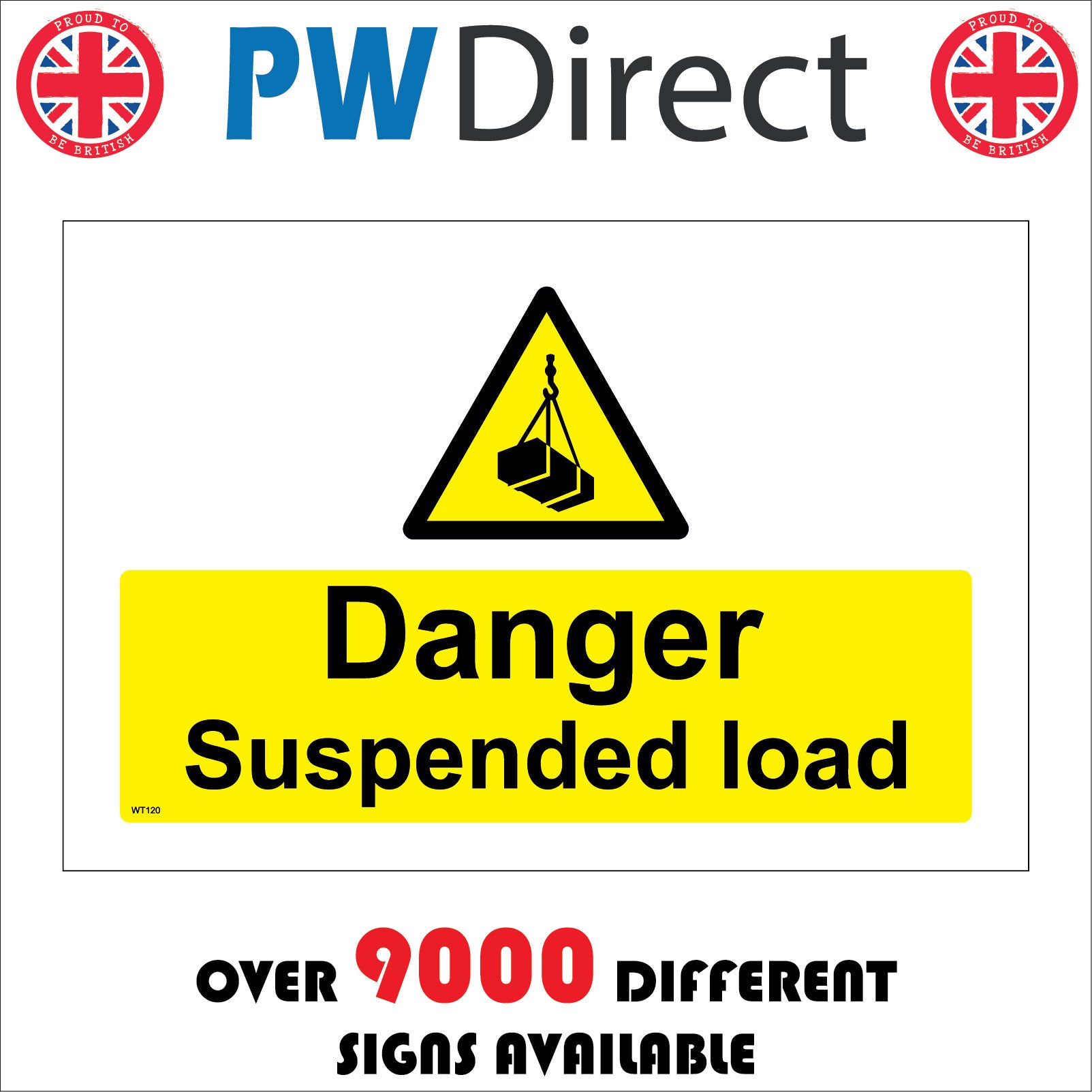 The format of the standard WT120 sign is Billboard Landscape and displays a Black Triangle Hook Load/Danger Suspended Load Overhead Crane Height text on a Yellow Background.