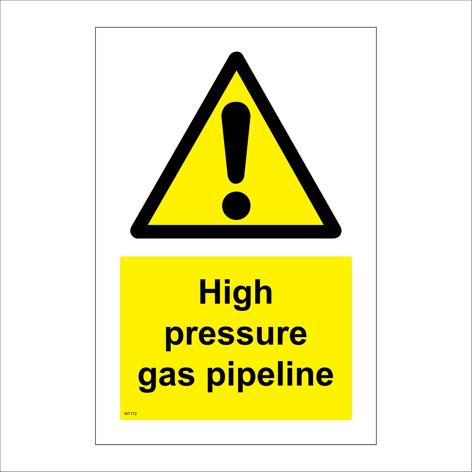 The format of the standard WT172 sign is Billboard Portrait and displays a Black Triangle Exclamation Mark/High Pressure Gas Pipeline text on a Yellow Background.