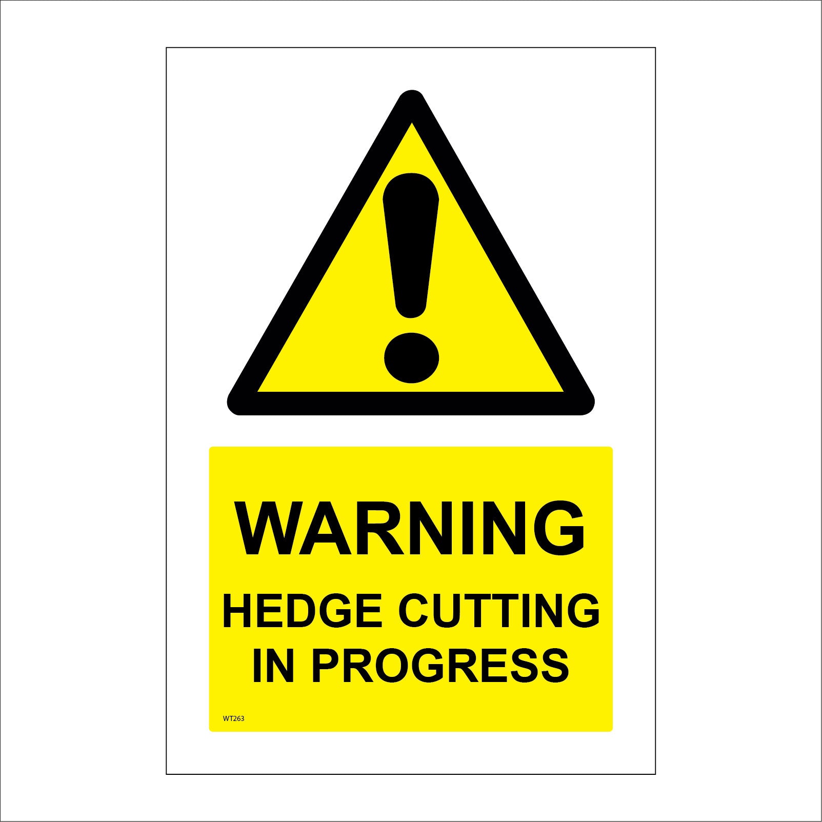 The format of the standard WT263 sign is Billboard Portrait and displays a Black Triangle Exclamation Mark/Warning Hedge Cutting In Progress text on a Yellow/Black Background.